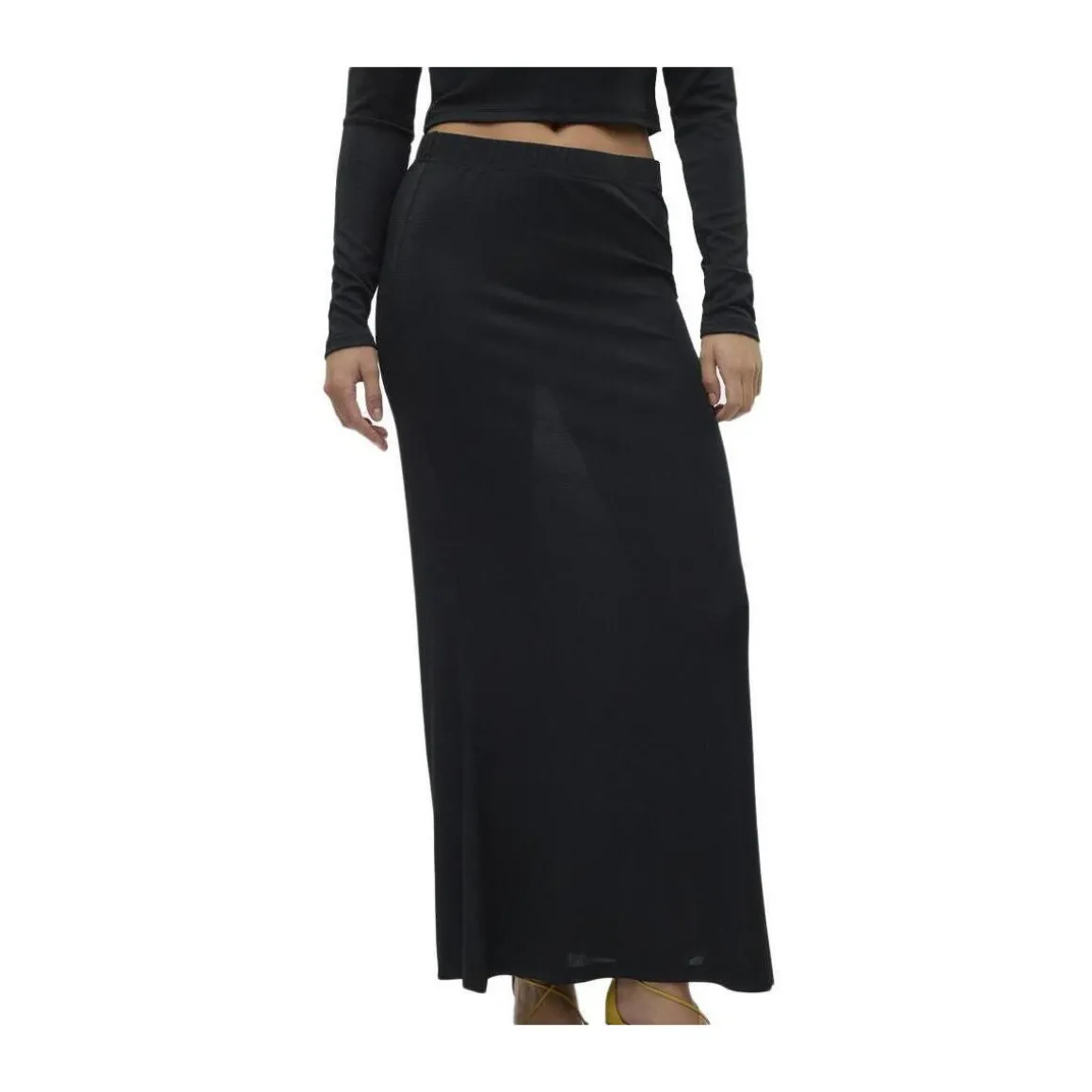 Optez pour cette jupe Vero ModaColoris : NoirÉlastique à la tailleLigne droiteTissu pailleté Composition : 73% polyester, 22% fibres métaliques, 5% élasthanne