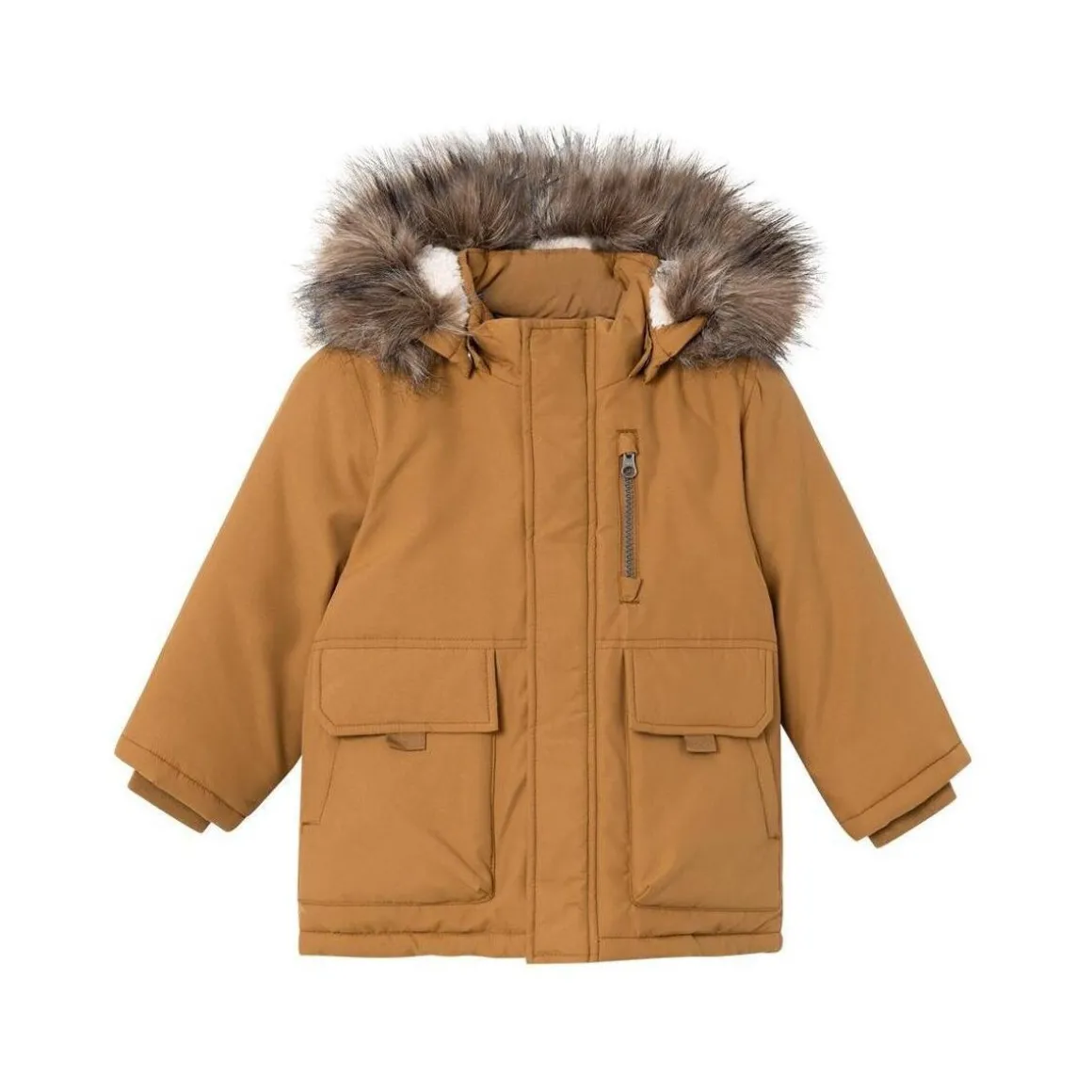 Optez pour ce manteau Name itColoris : MarronAvec capucheManches longues1 poche zippée verticalement poitrine gauche, 2 poches latérales à rabatCapuche détachable en fausse fourrure beigeExtrémité des manches resserréeComposition : 100% Polyester