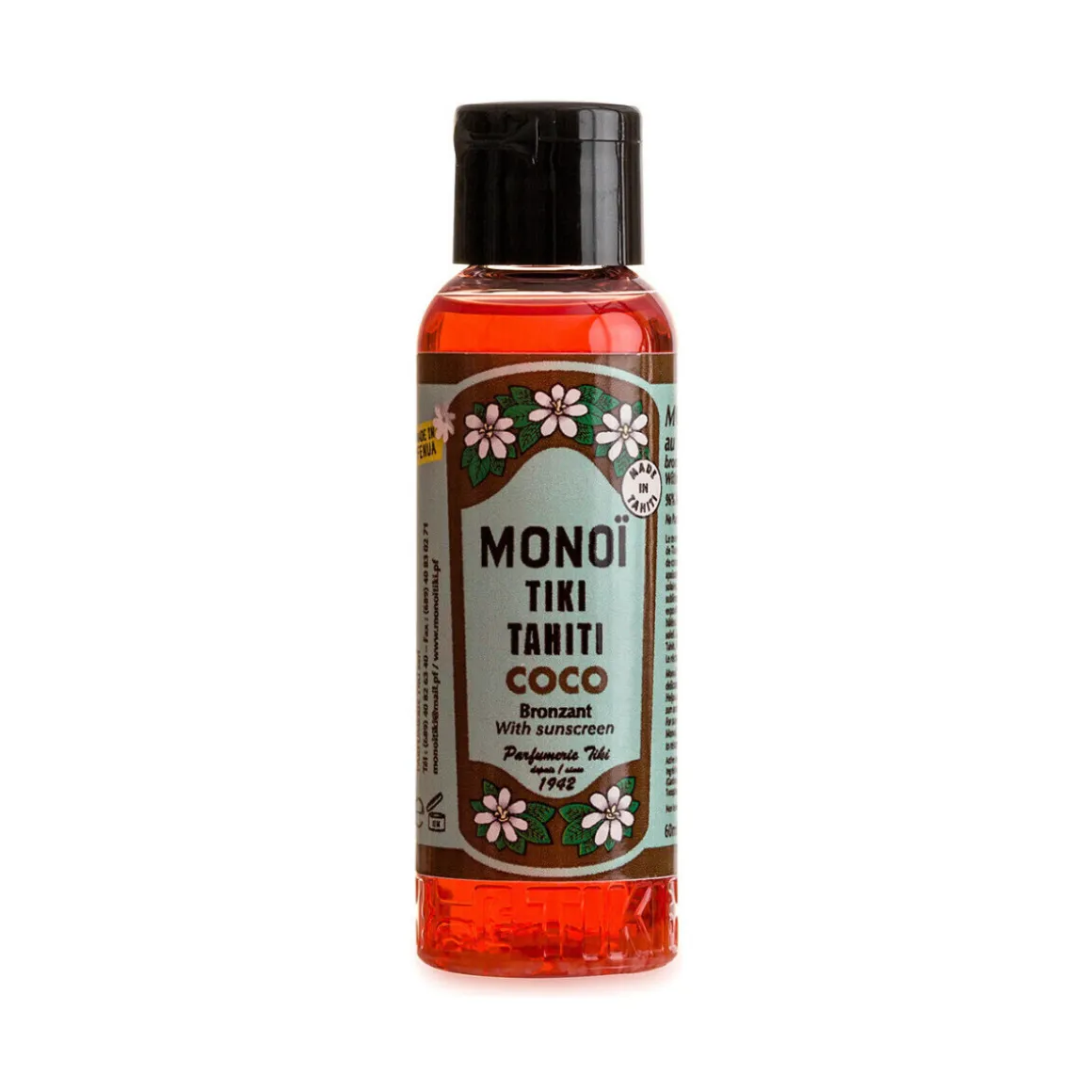 – Composition : 96% Monoï de Tahiti Appellation of Origin (AO). Cocos nucifera (coconut) oil, Gardenia Taitensis Flower Extract, Ethyl hexyl salicylate (filter), Parfum (Fragrance), Tocopherol (Vitamin E), CI26100, Coumarin