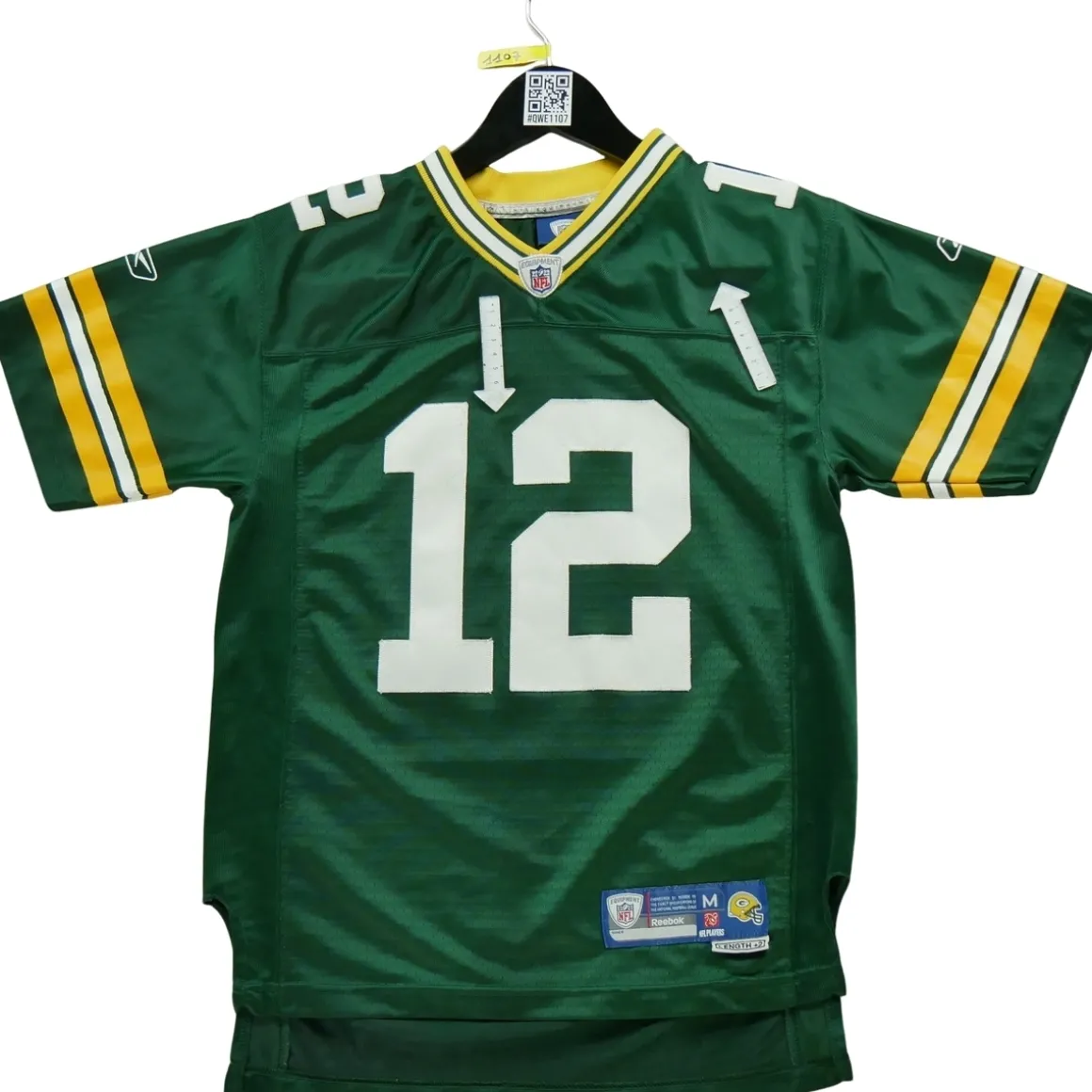 Offrez ce maillot NFL Green Bay Packers à un jeune fan de football américain pour lui faire plaisir à coup sûr, tout en lui apprenant les valeurs du partage et de l’économie circulaire. POURQUOI CHOISIR UN PRODUIT DE SECONDE MAIN ? Choisir un produit d’occasion, c’est faire un geste pour l’environnement en prolongeant la durée de vie d’un objet déjà existant. De plus, c’est souvent une solution plus économique pour acquérir des produits de qualité. Nous vérifions et nettoyons chacun de nos produits d’occasion pour vous offrir un produit de qualité, prêt à être utilisé. En optant pour ce maillot NFL Green Bay Packers de seconde main, vous faites le choix de la durabilité et de l’authenticité, tout en soutenant une démarche éco-responsable. NOTRE ENGAGEMENT QUALITÉ Nous sommes fiers de vous offrir des produits d’occasion en excellent état. Tous nos produits ont été soigneusement vérifiés et nettoyés par nos experts pour vous garantir une qualité irréprochable. Nous sommes également à votre disposition pour répondre à toutes vos questions et vous aider à trouver le produit qui convient le mieux à vos besoins et à votre budget. CONCLUSION Ce maillot vert pour femme NFL Green Bay Packers de la marque Reebok en taille 10/12 ans est un vêtement de seconde main en bon état, vérifié et nettoyé par nos experts. Il est idéal pour afficher votre passion pour le football américain de manière authentique et éco-responsable. En optant pour ce produit, vous soutenez une démarche durable tout en bénéficiant d’un vêtement de qualité à un prix abordable. N’hésitez pas à nous contacter si vous avez des questions ou si vous souhaitez obtenir plus d’informations sur ce maillot NFL Green Bay Packers. Remarques : imperfections signalées par les flèches