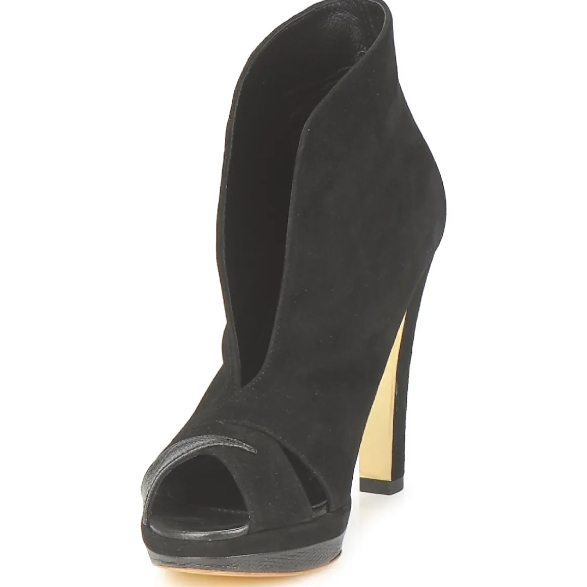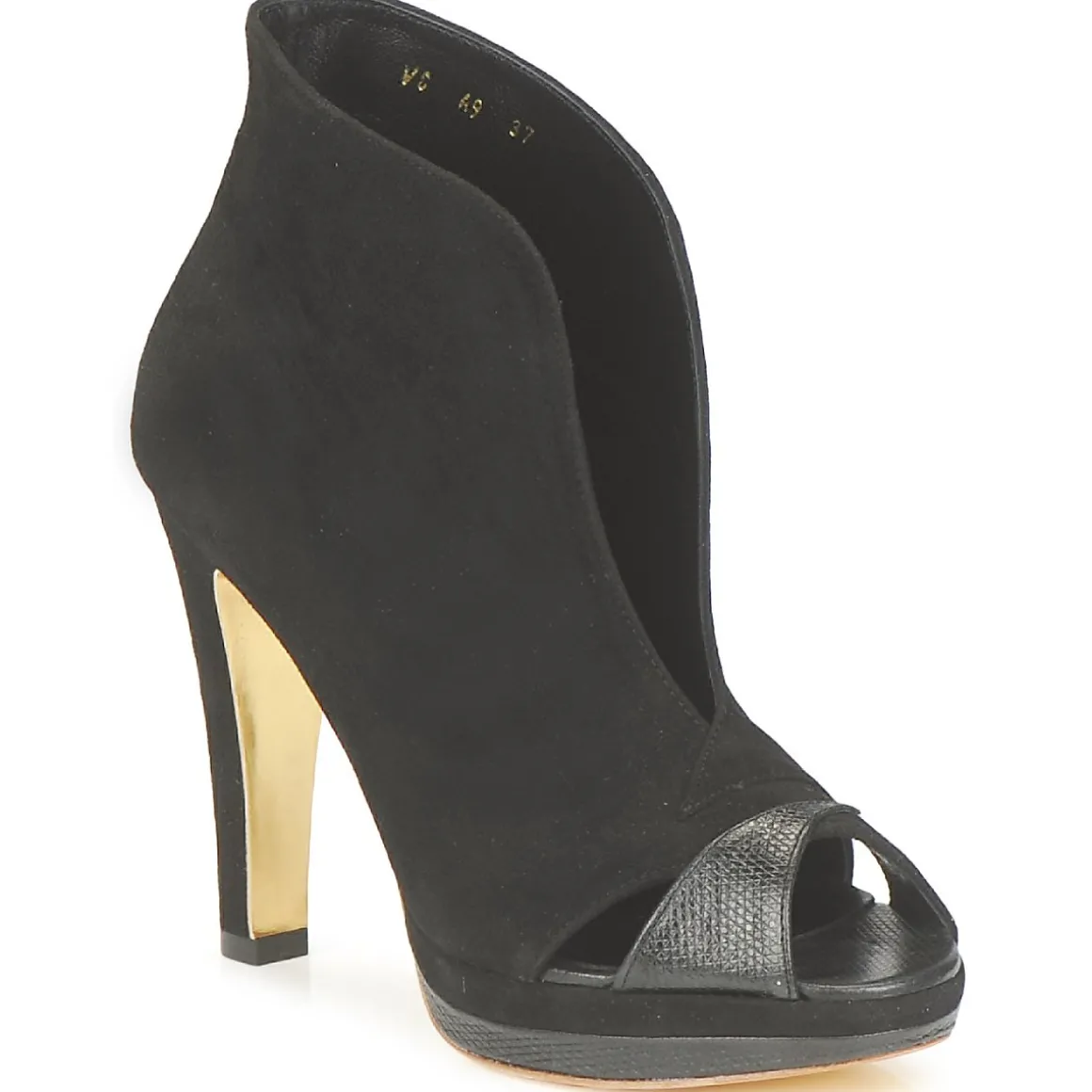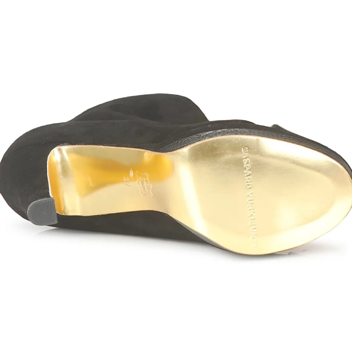 Low Boots Gaspard Yurkievich en cuir de veau velours. Avant-pied ajouré avec empiècement en simili serpent. Décolleté prononcé sur le cou-de-pied. Semelle patinée dorée, symbole des collections Urban & Contemporary de la maison avec film protecteur à ôter