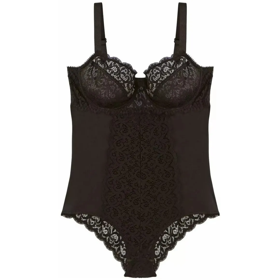 Body slip spécialisé grand maintien avec ces bonnets en tout dentelle doublés de tulle. Nœud plat en gros grain pour habiller l’entresein. Larges bretelles plates élastiquées et réglables dans le dos, finition dos cheminée. Agrafage 3×3 position. Large bande de dentelle à l’avant du body, entièrement doublé de tulle pour garantir un maintien optimal. Les cotés et le dos sont en microfibre unie. Le bas des fesses est couvert d’un empiècement de dentelle pour un rendu féminin. Ce body est fermé à l’entrejambe par 3 pressions, réglables sur 2 positions.