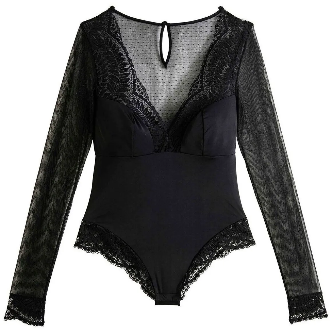 Body manches longues en microfibre unie. Dentelle esprit feuillage et dos en tulle plumetis. Disponible du 36/38 au 46/48.