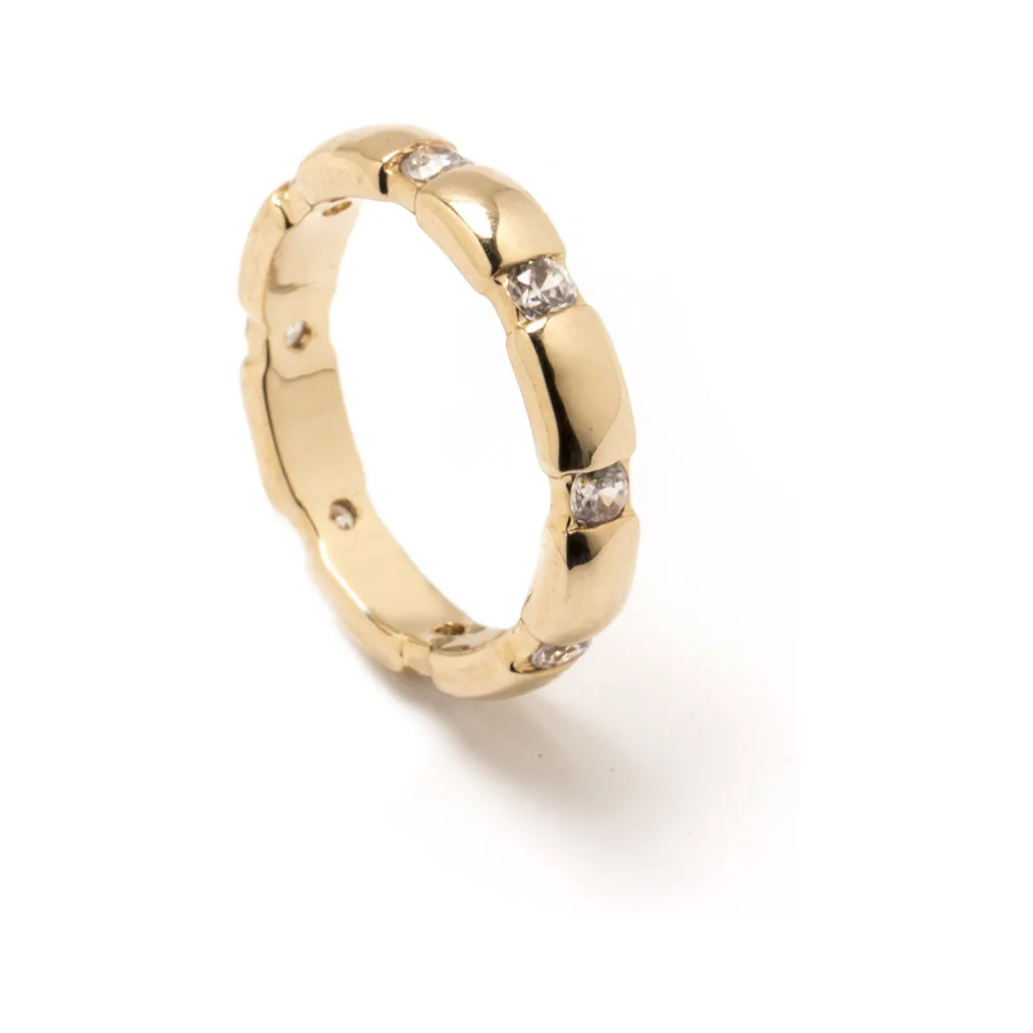Alliance alternée plaqué or avec zirconias blancs. L’appellation plaqué or est réservée aux bijoux dont le revêtement d’or est égal ou supérieur à l’épaisseur de 3 microns d’or 750/1000e.