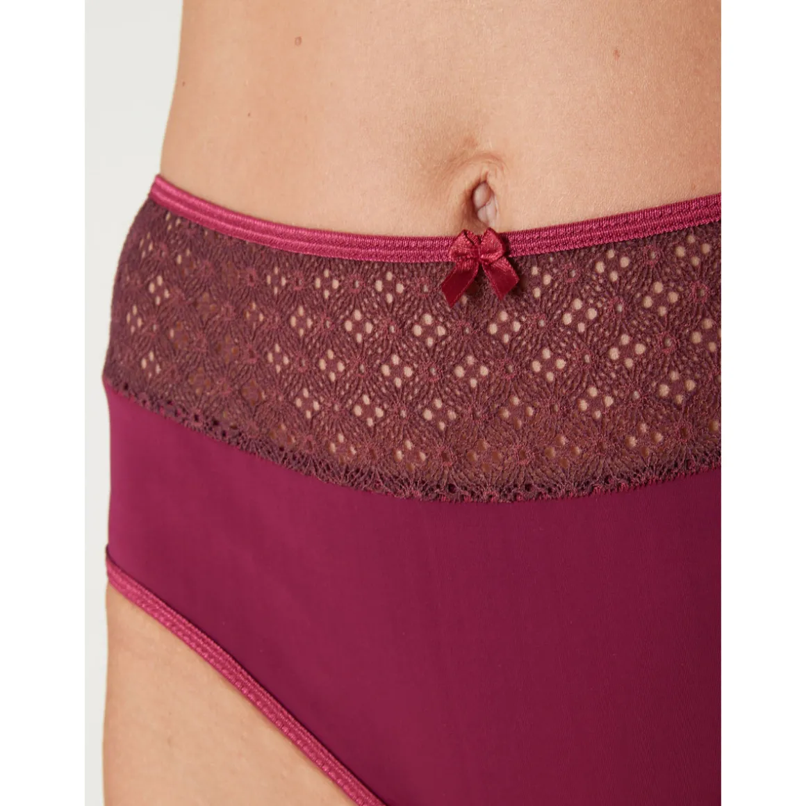 Empiècement en dentelle fantaisie. Effet ventre plat. Devant et dos en maille microfibre. Petit noeud à la taille haute. Elastique plat satiné à la taille et aux jambes. Fond doublé coton.