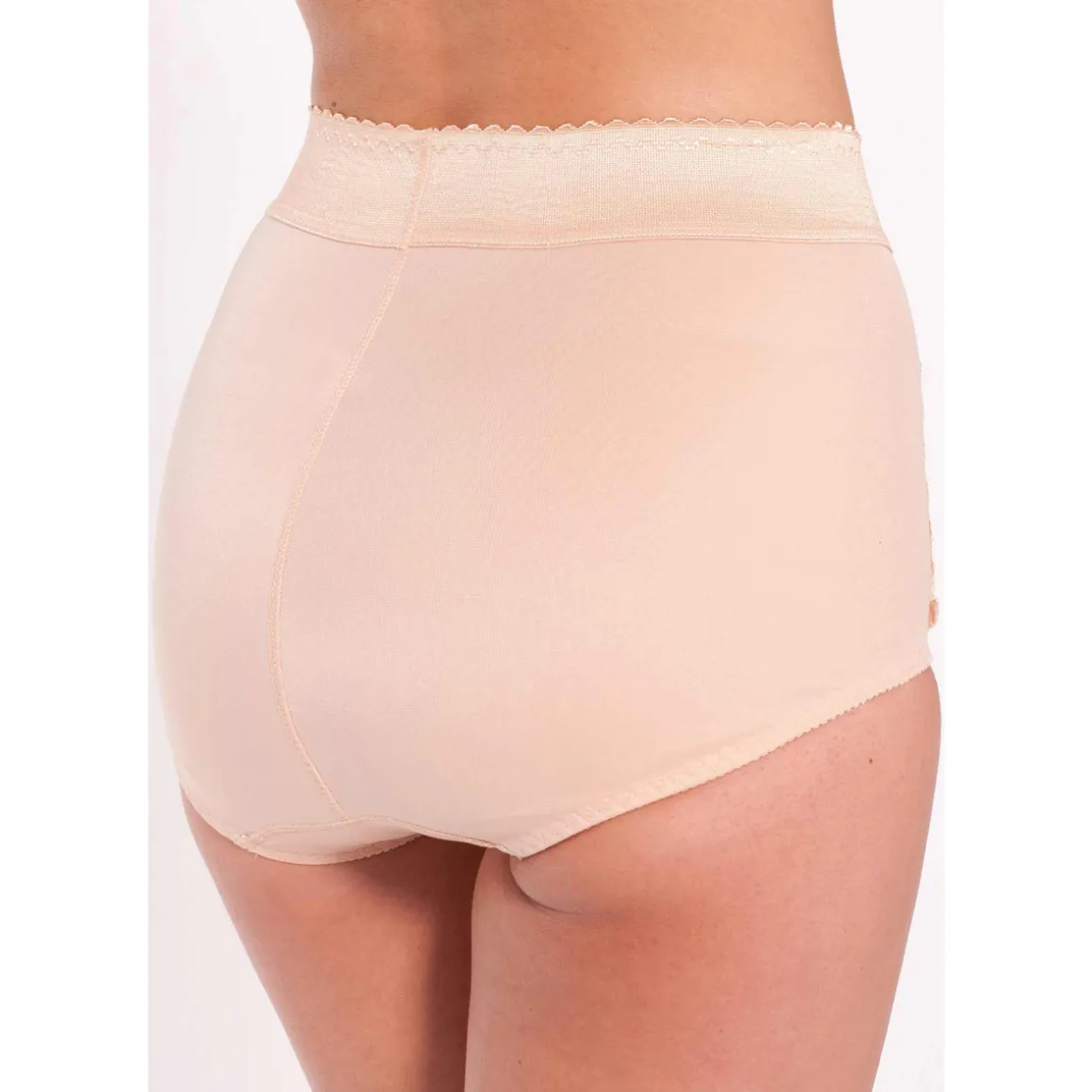 Affine la silhouette discrètement en effaçant le ventre. Plastron double épaisseur souligné d’une fine dentelle. Large élastique duveteux à la taille haute. Découpe galbée au dos. Entièrement doublée. Fond doublé coton.Photo retouchée