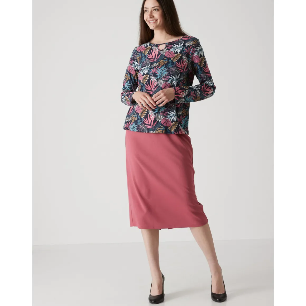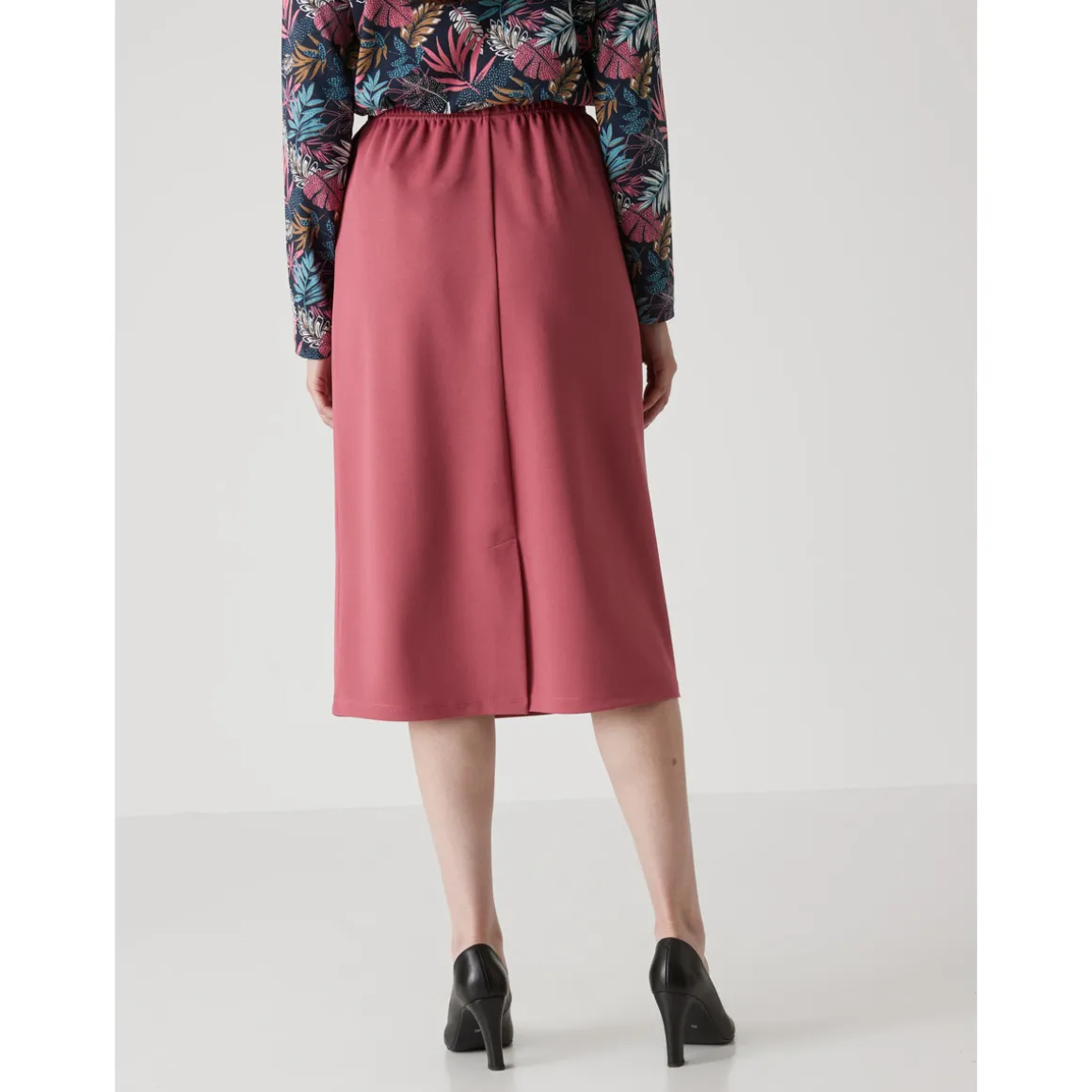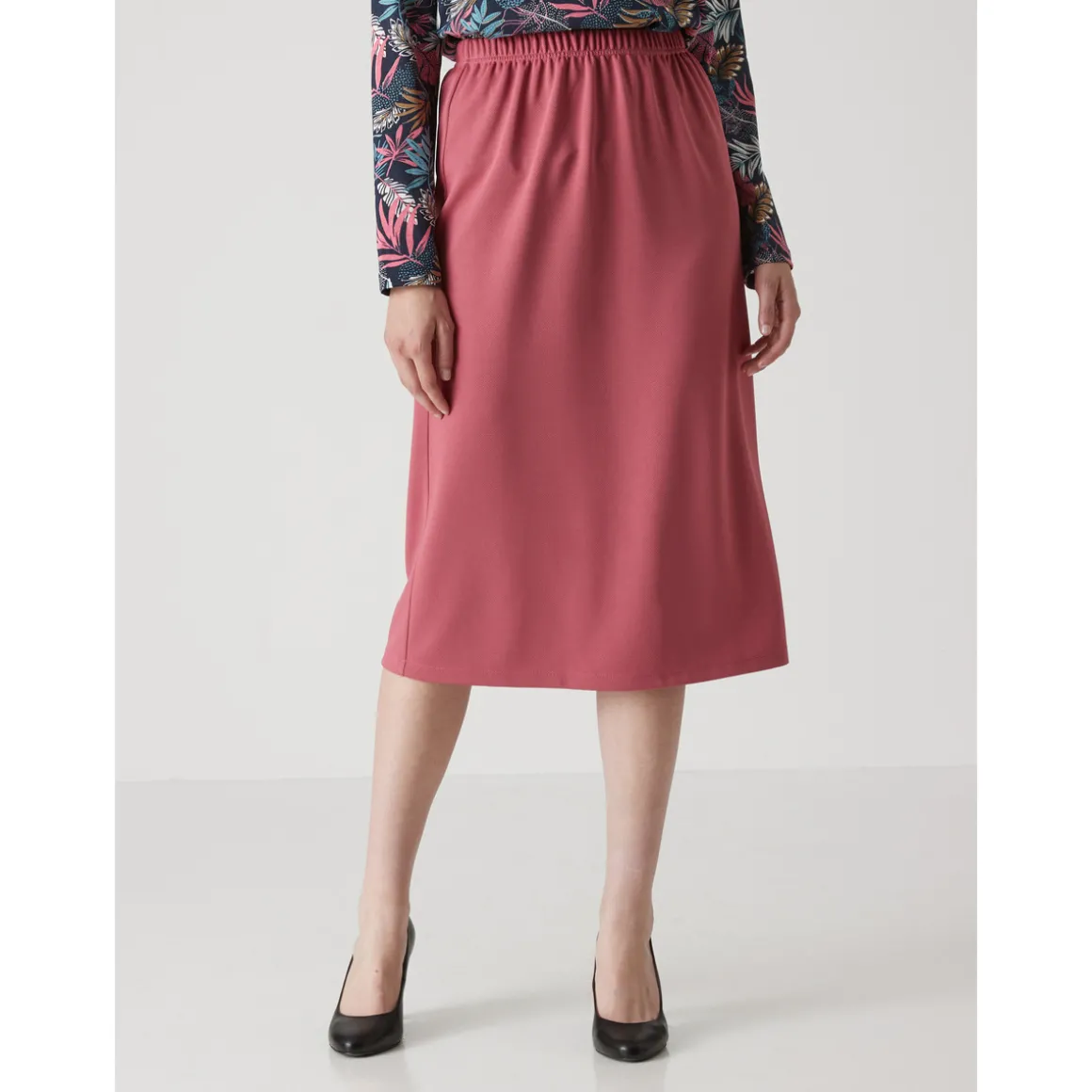 Une jupe confortable et facile à assortir ! Taille entièrement élastiquée. Fente au dos. Ourlet invisible. Maille infroissable et au beau tomber lourd : ne se déforme pas et se lave en machine. Longueur : 68 à 70 cm selon les tailles.Photo retouchée