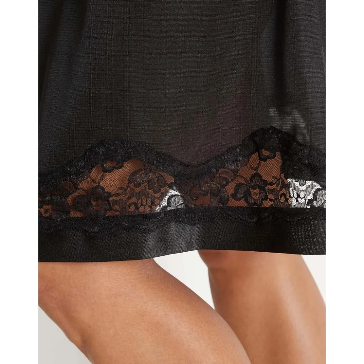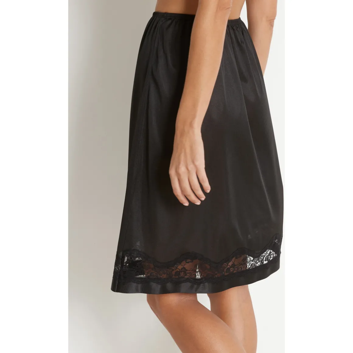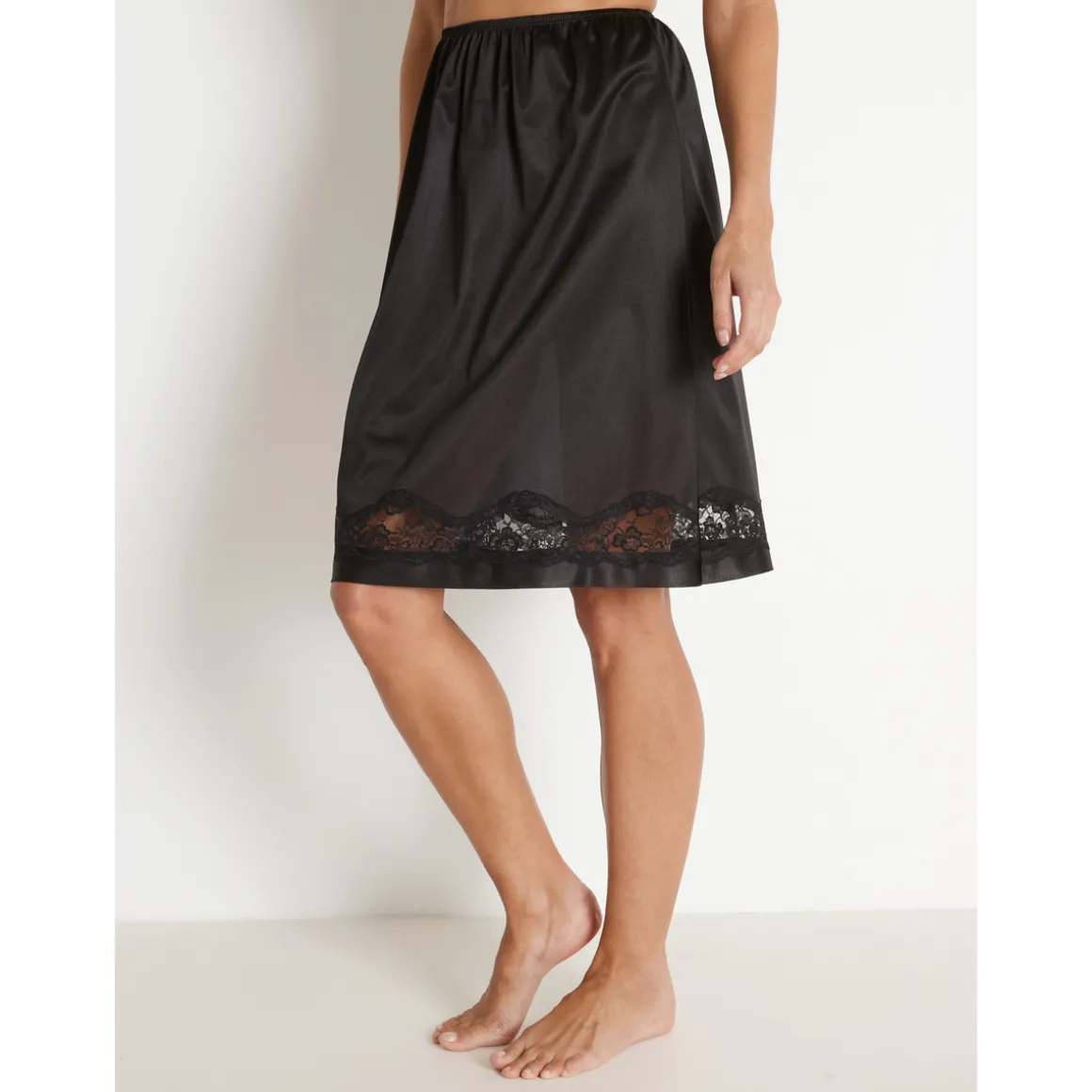 Entre-deux en dentelle incrustée. Taille élastiquée. Base ourlée n’accrochant pas les collants. Longueur 60cm environ. Maille traitée antisatique.