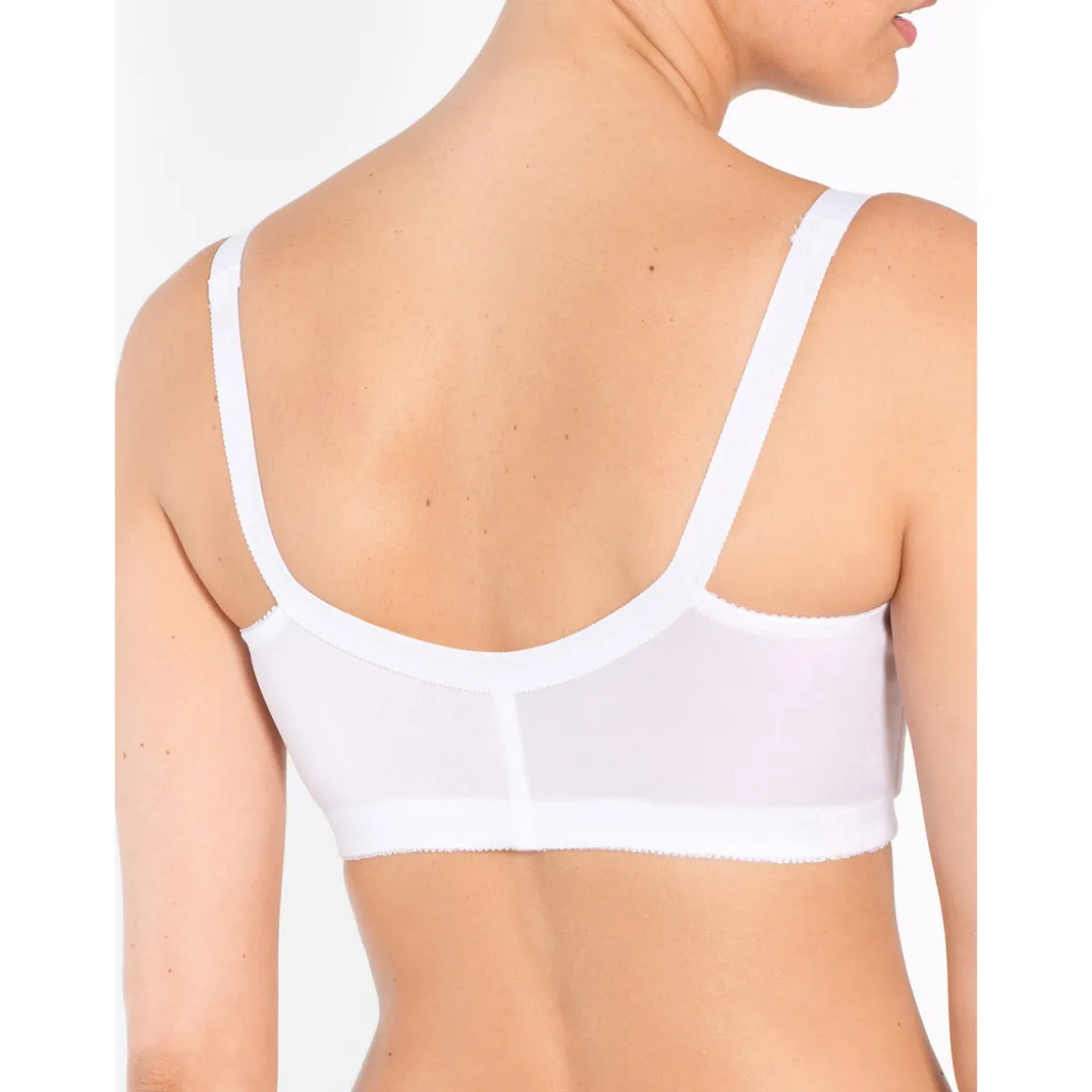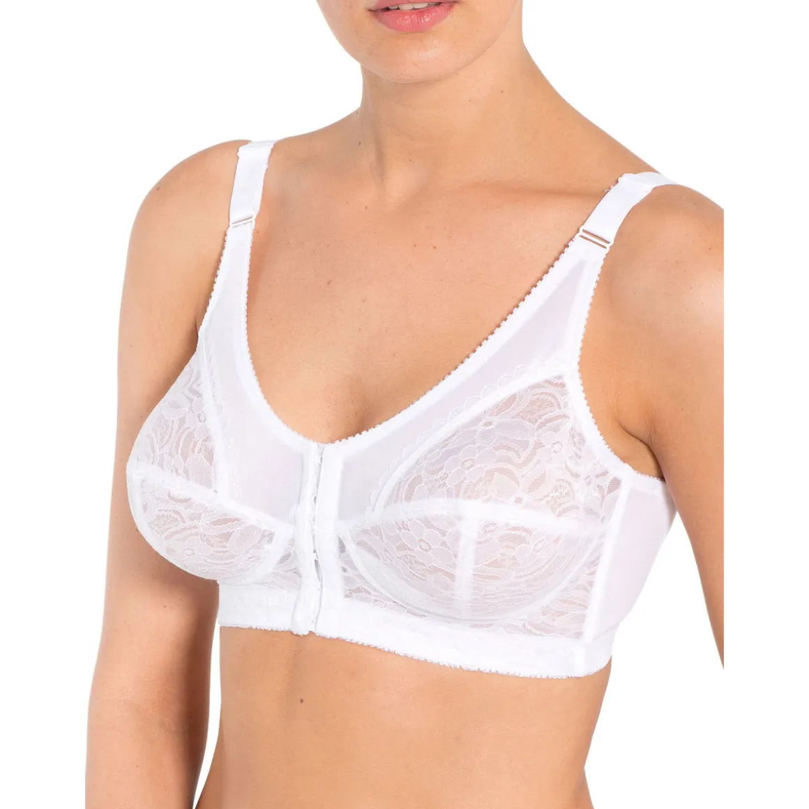 L’agrafage devant facilite leur enfilage et leur retrait. Bonnets 3 parties en dentelle doublée. A la base, renforts ouatinés en demi-lune pour le soutien. Fermeture devant par 5 agrafes. Baleines souples côtés. Large élastique duveteux à la base. Lot de mêmes taille et coloris.Photo retouchée