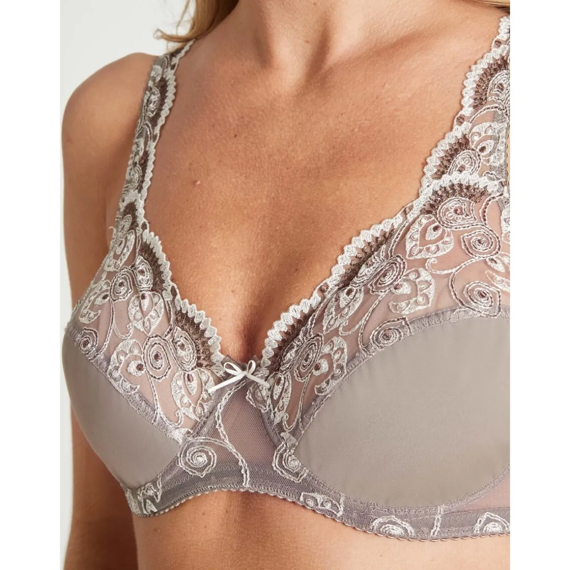 – Avec armatures- Haut des bonnets 2 parties en tulle brodé, bas en microfibre doublée- Noeud fantaisie à l’entre-bonnets en tulle- Haut des larges bretelles, réglables au dos, en tulle.- Triple agrafage, 3 positions COMPOSITION87% polyamide, 13% élasthanne.
