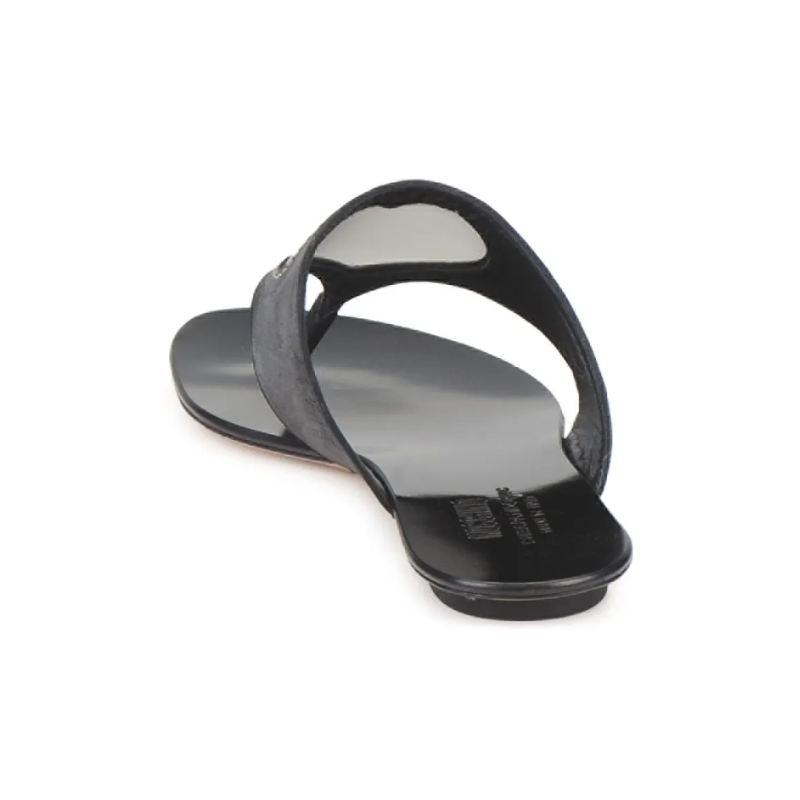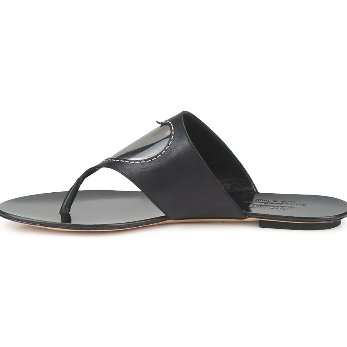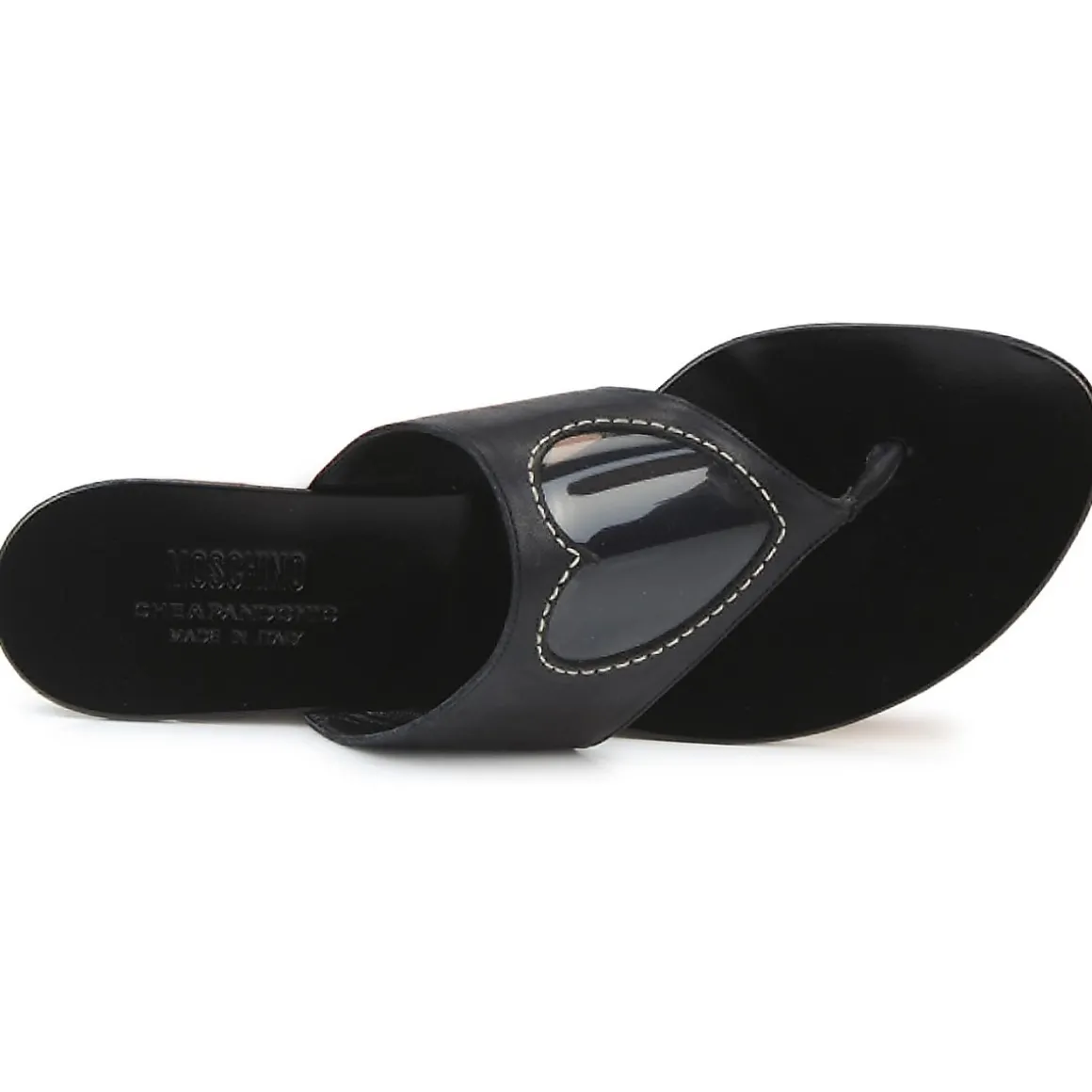 Tong Moschino Cheap & Chic avec petit talon. Bride à entredoigts agrémentée d’un coeur apparaissant à travers une texture transparente pour un soupçon d’humour dans une tendance girly.
