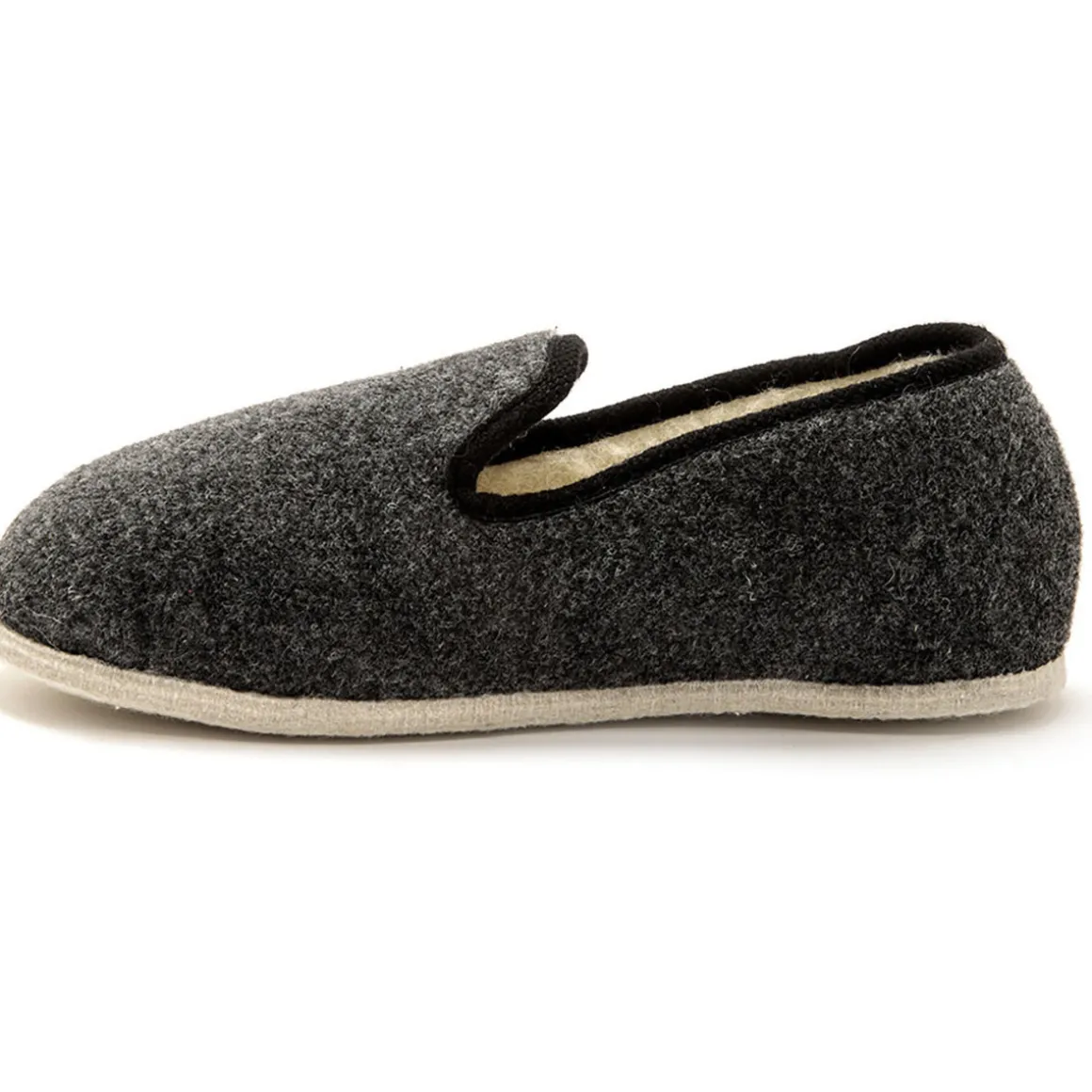 Dessus textile, doublure et semelle intérieure en laine douillette. Légère et silencieuse, la semelle en feutre respecte les sols. Largeur confort.