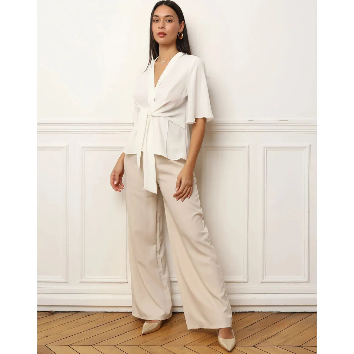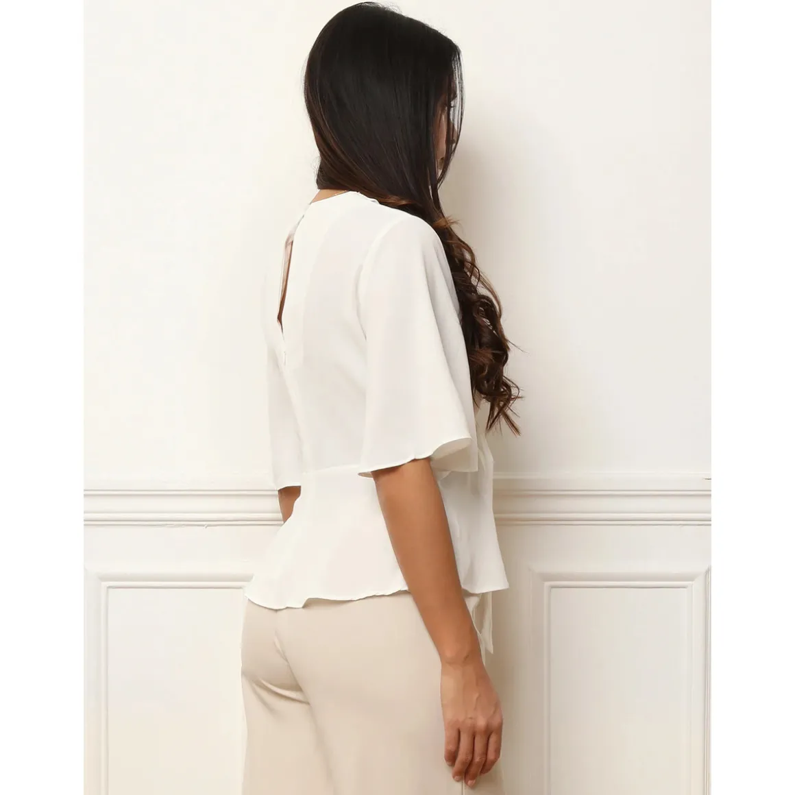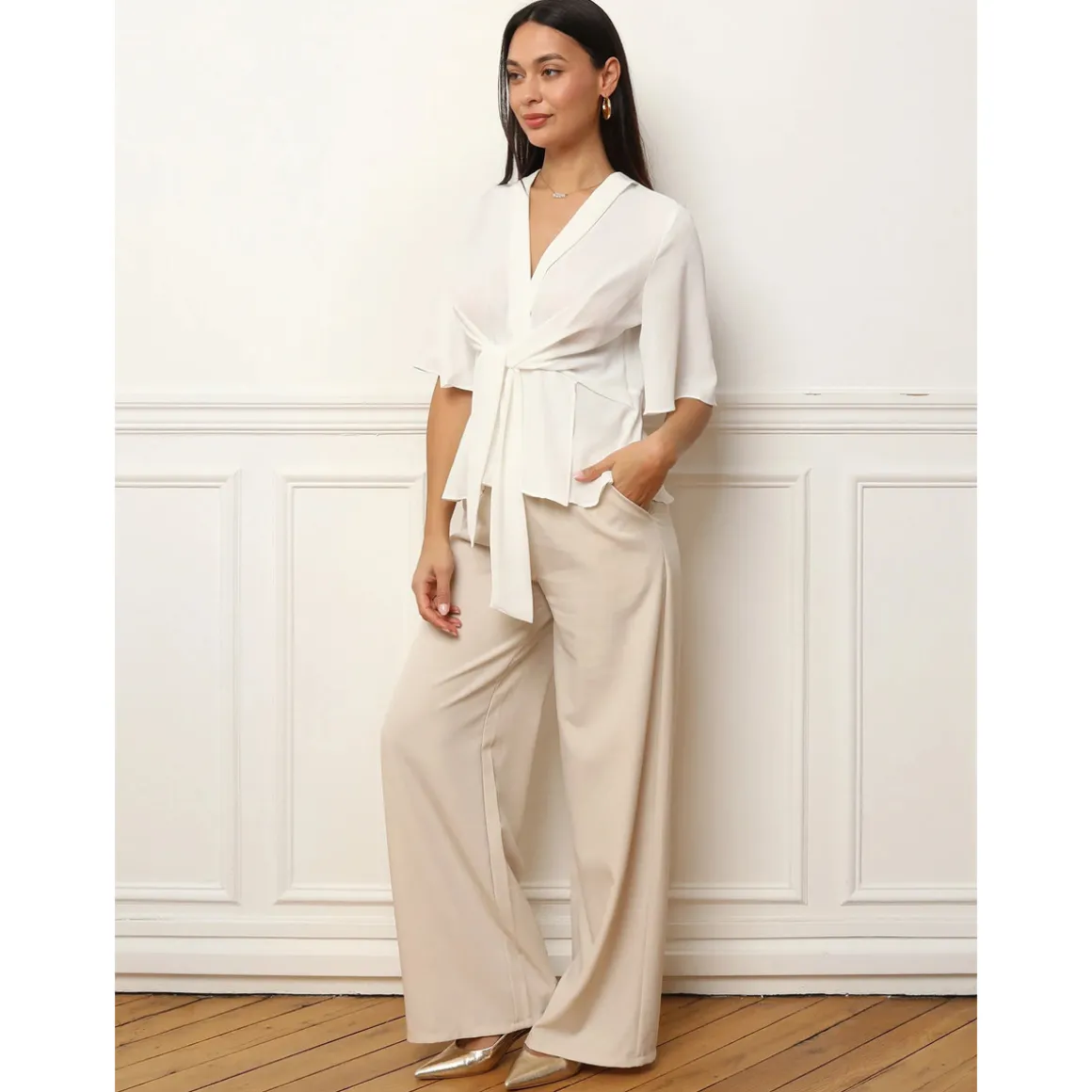 Blouse fluide avec pans à nouer sur le devant.Manches papillons et petit revers sur l’encolure.Ouverture au dos avec fermeture zippée et bouton.
