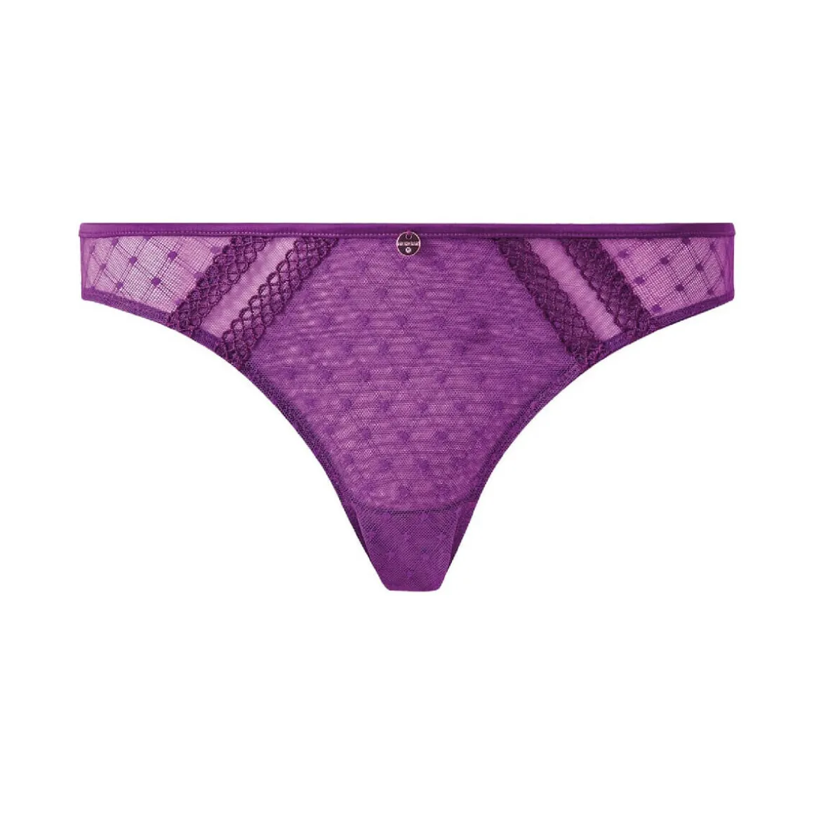 Culotte en tulle fantaisie avec jeu de transparence. Biais en satin et galons. Bijou métallique logotée MORGAN à la ceinture élastiquée en satin. Fond doublé d’un gousset 100% coton. Disponible du 38 au 46.