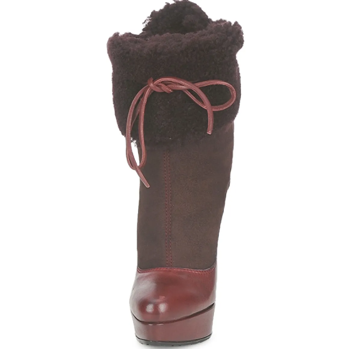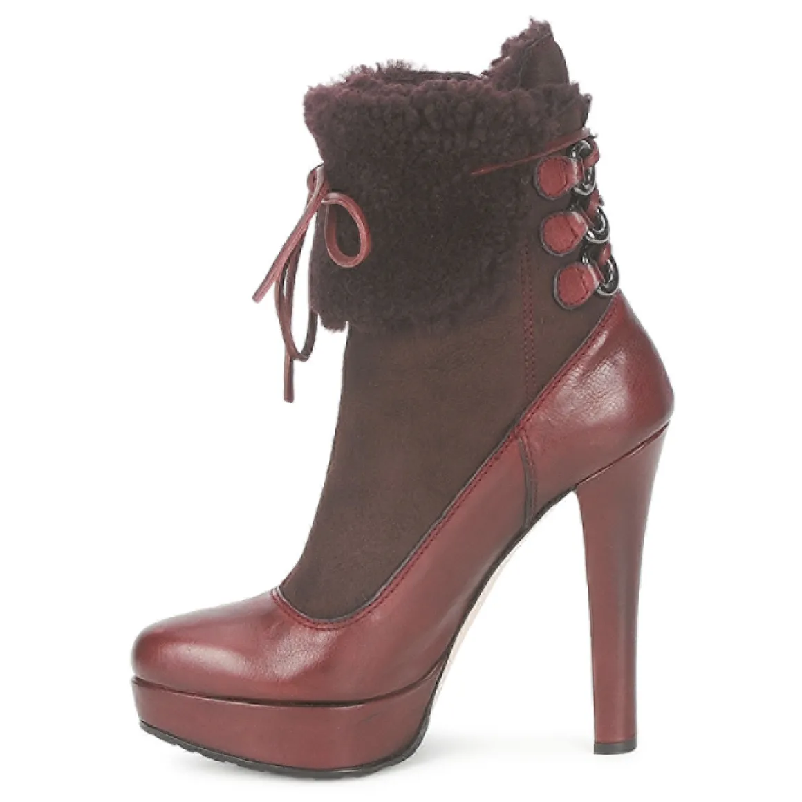 Bottine Sebastian donnant l’illusion d’un escarpin en trompe l’oeil. Revers molletonné avec laçage sur l’arrière passant dans des anneaux en métal et se nouant sur le devant. Belle hauteur de talon adoucie par la présence d’un plateau avant. Semelle crantée antidérapante.