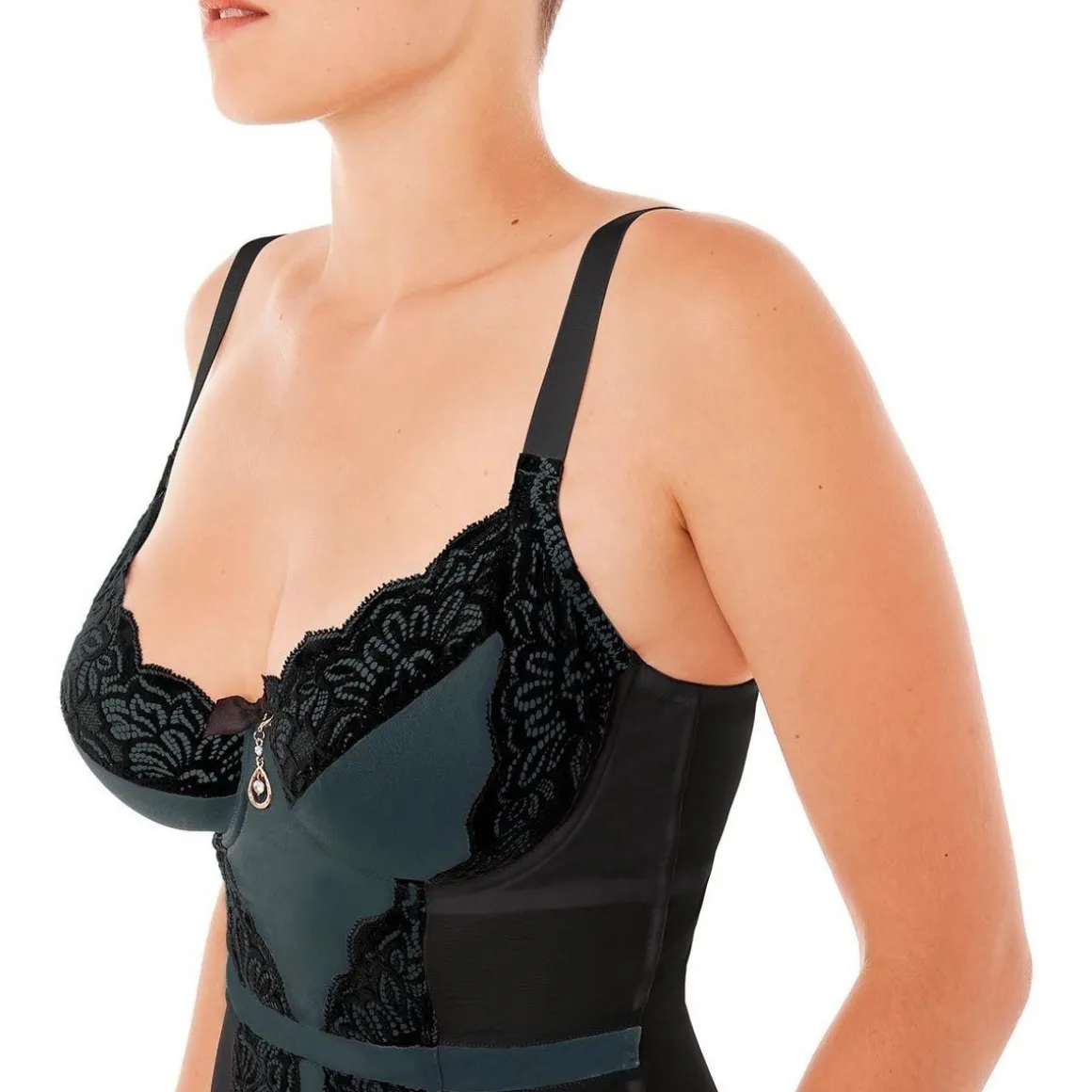 Guêpière armaturée. Microfibre shiny et dentelle florale. Nœud satin et bijou strass à l’entre-seins. Bretelles larges réglables. Fermeture 13 agrafes, 3 positions. Porte-jarretelles associé. Disponible du 90D au 110E