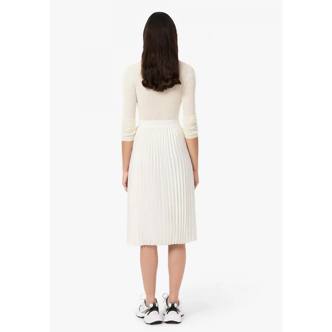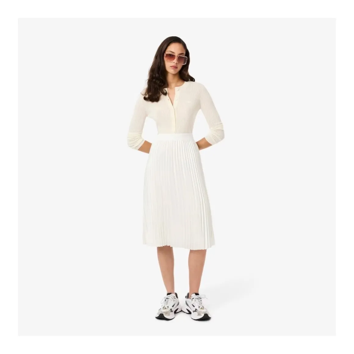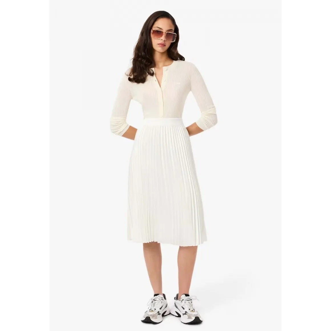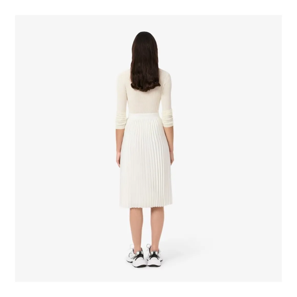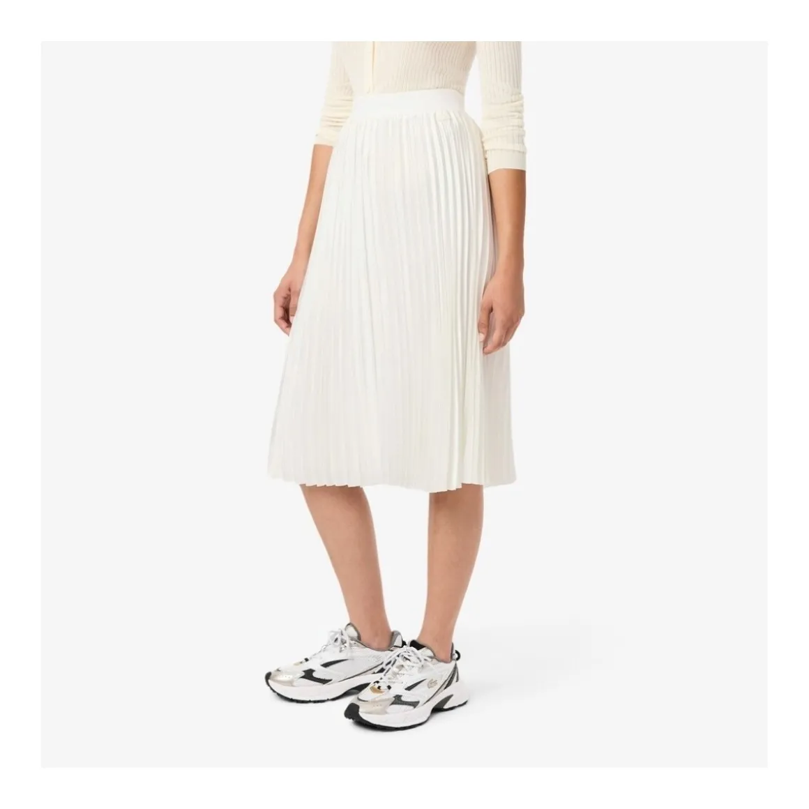 JF5605 SKIRT Esta falda plisada de Lacoste con un largo por debajo de la rodilla es una pieza icónica del armario de la marca. Forma parte de la colección Embrace fall icons que rinde homenaje al ADN de la elegancia deportiva francesa de la firma. Su confección se basa en un tejido brillante y sedoso elaborado a partir de poliéster reciclado. Para garantizar una sujeción cómoda la cintura es de canalé. El diseño se completa con un cocodrilo de 2 5 cm bordado y cosido tono sobre tono. Esquema: Marca: LacosteColección: Embrace fall icons un homenaje a nuestro ADN de Elegancia Deportiva FrancesaLargo: Por debajo de la rodillaDiseño: Falda plisadaTejido: Brillante y sedoso hecho de poliéster recicladoLogotipo: Cocodrilo bordado de 2 5 cm cosido tono sobre tonoCintura: De canalé para sujetar cómodamenteCaracterística: Pieza icónica del armario de Lacoste