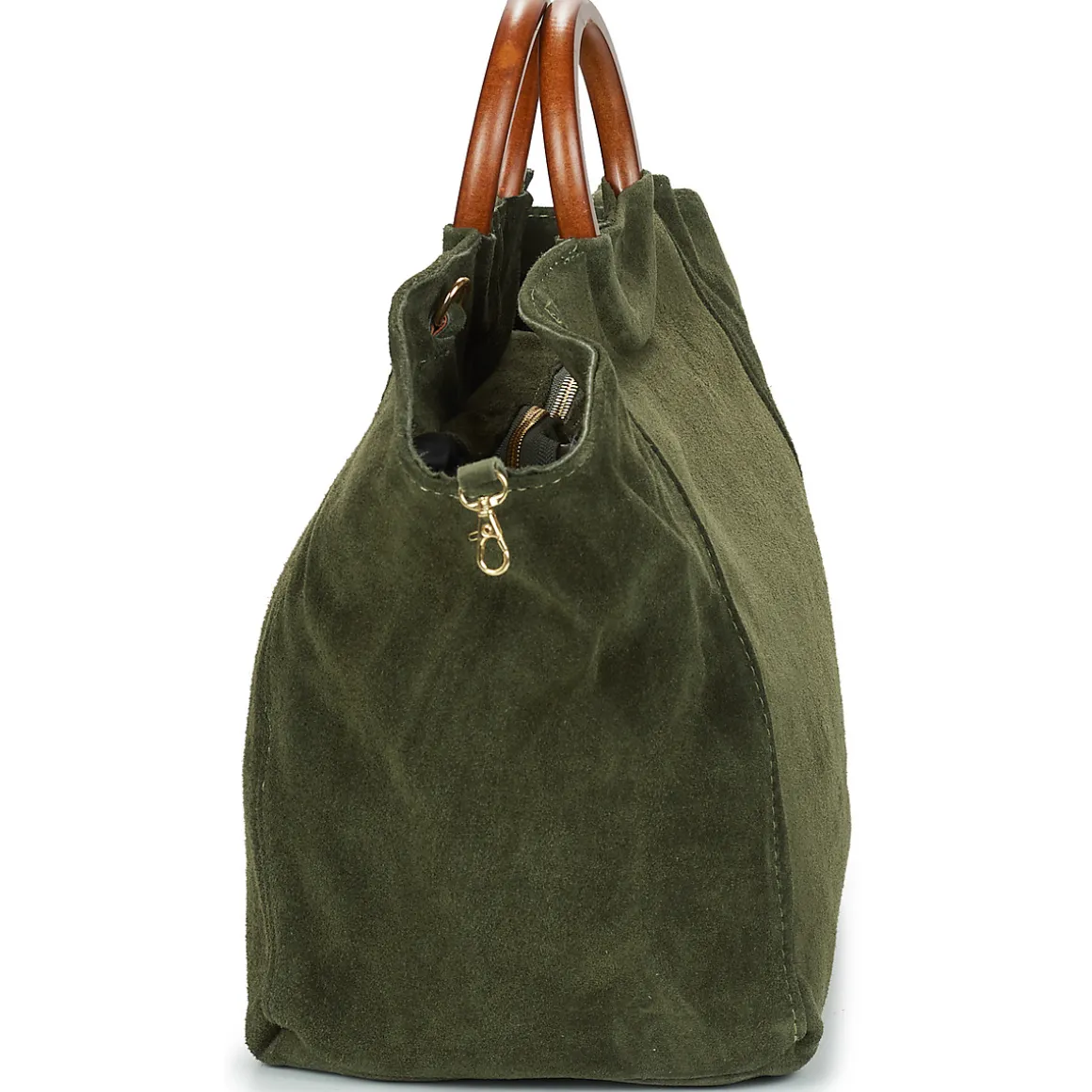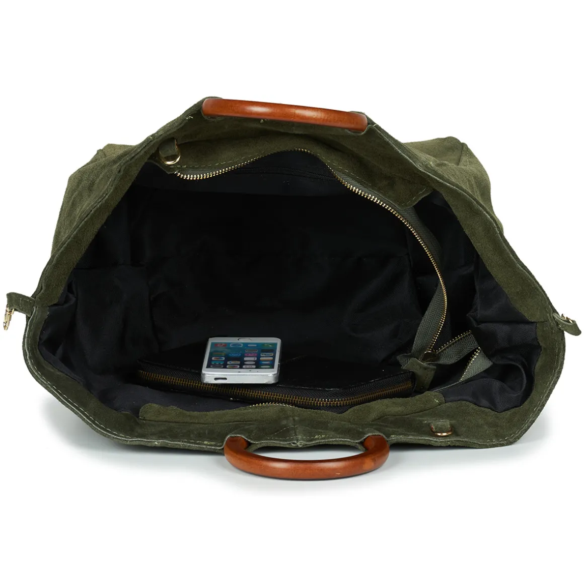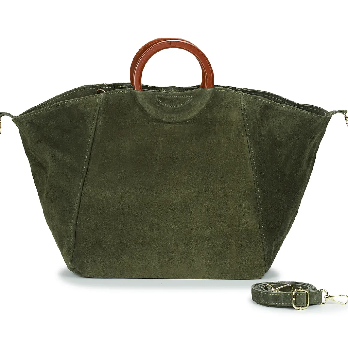 Sac porté main en croûte de cuir de vachette anse en bois / Deux formes possibles / Bandoulière réglable et amovible / Pochette intérieure zippée.