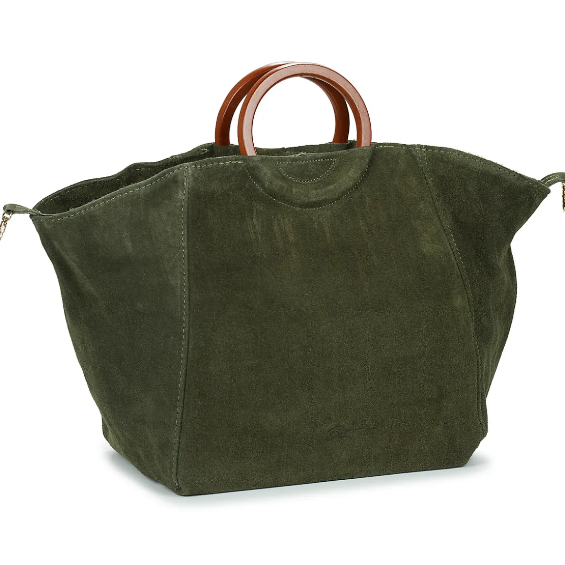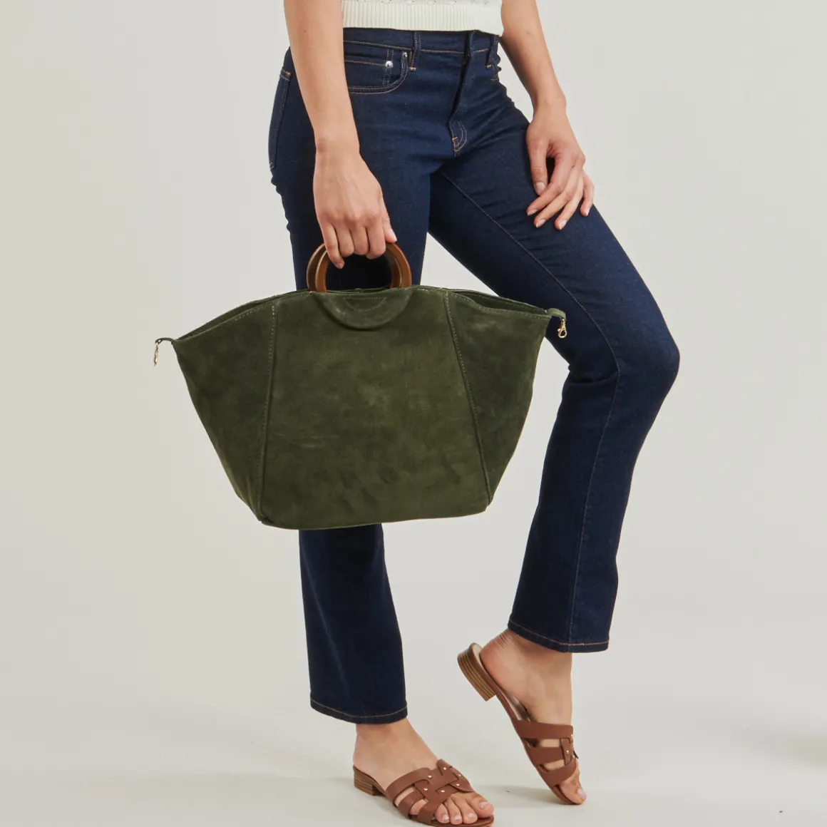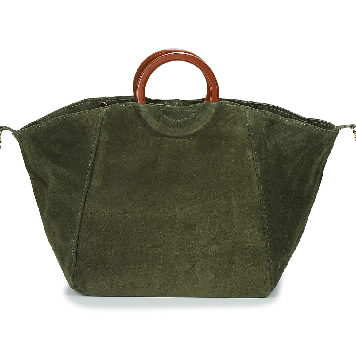 Sac porté main en croûte de cuir de vachette anse en bois / Deux formes possibles / Bandoulière réglable et amovible / Pochette intérieure zippée.