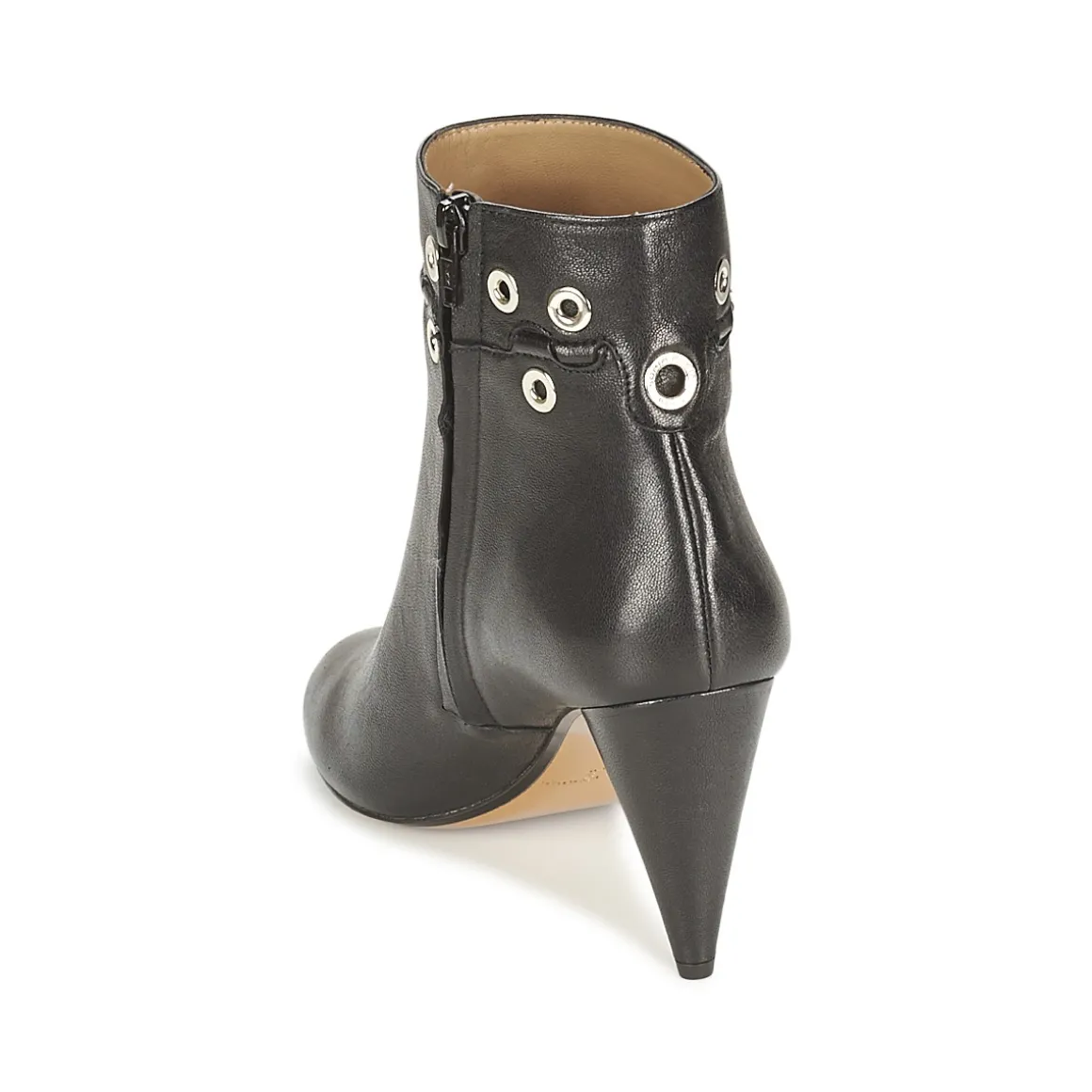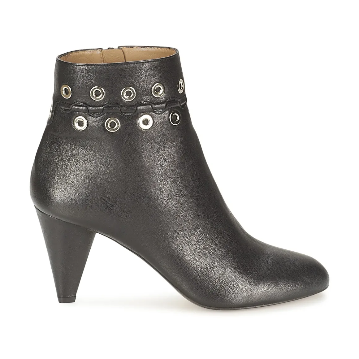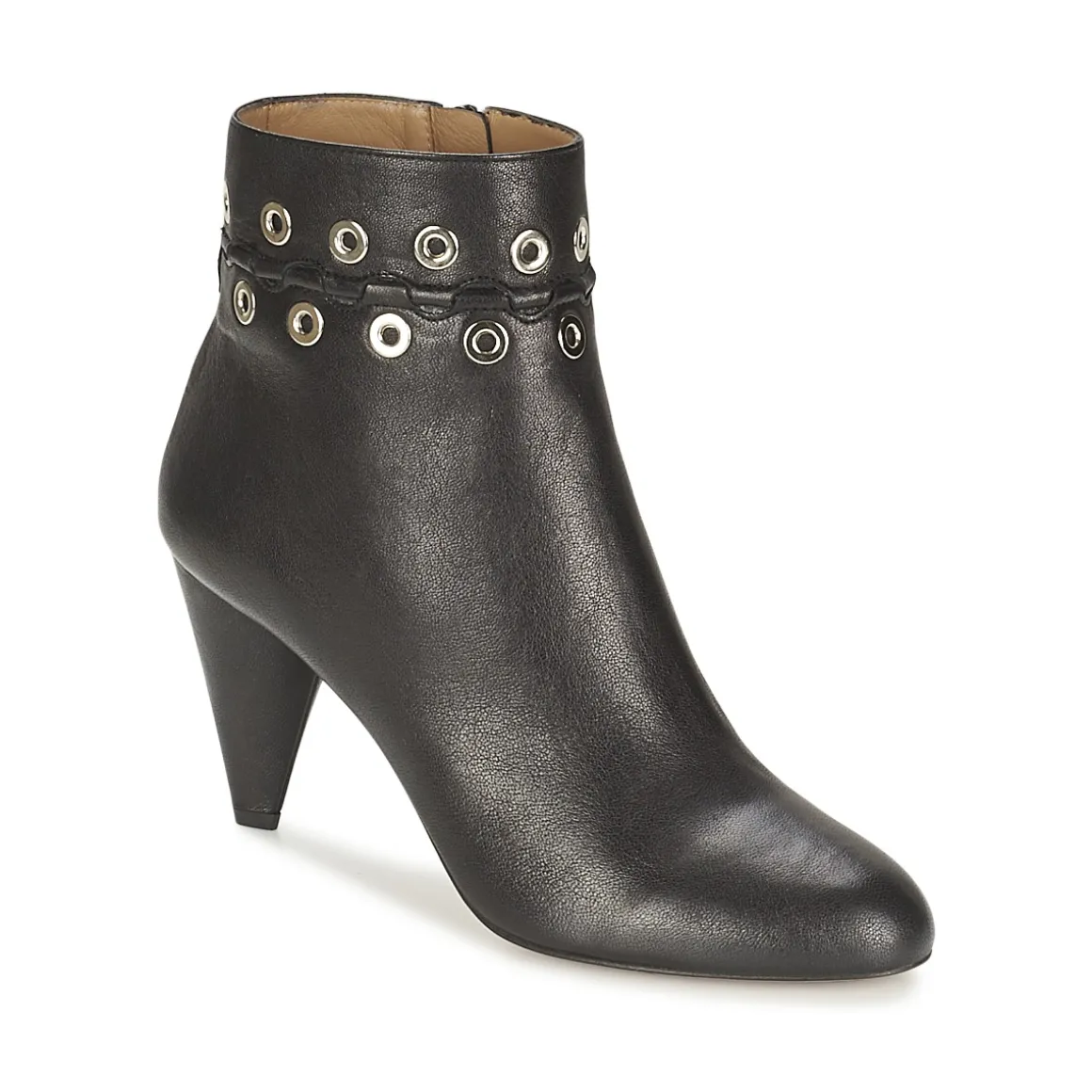 Bottines Sonia Rykiel de couleur noire. Tige lisse légèrement texturée avec décoration illets métalliques argentés. Fermeture par glissière sur face intérieure du pied. Talon de forme conique et bout de pied arrondi.