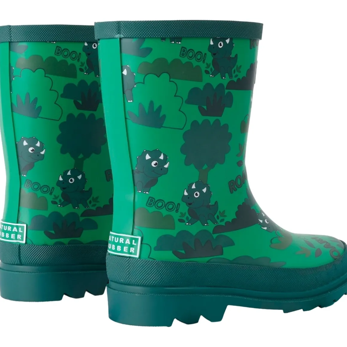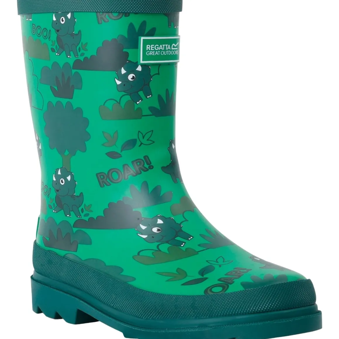 Regatta – Bottes de pluie MUDPLAY – Enfant. Design/motif: Imprimé intégral, Dinosaure, Feuille, Logo, Arbres. Style du bout: Arrondi. Talon: Plat. Fermeture: À enfiler. Caractéristiques: Protection anti-boue en caoutchouc. Caractéristiques des matériaux: Durable, Imperméable, Résistant aux intempéries. Dessus: Caoutchouc vulcanisé. Semelle intérieure: TECFOAM. Semelle extérieure: Crans angulaires, Adhérente, Caoutchouc. Ref: UTRG11079