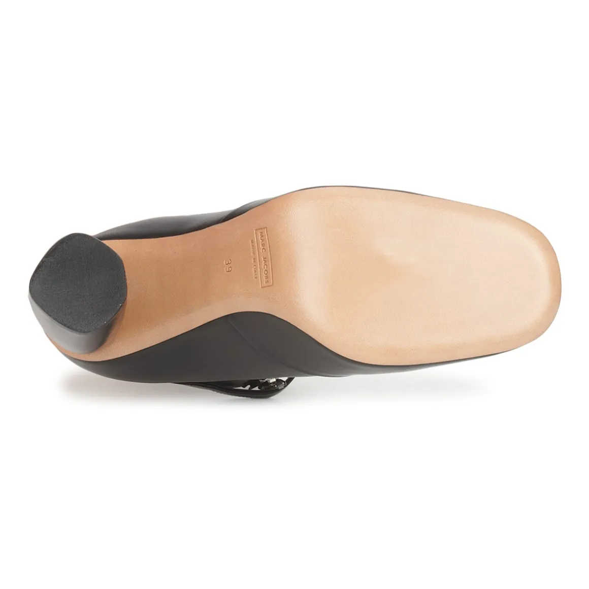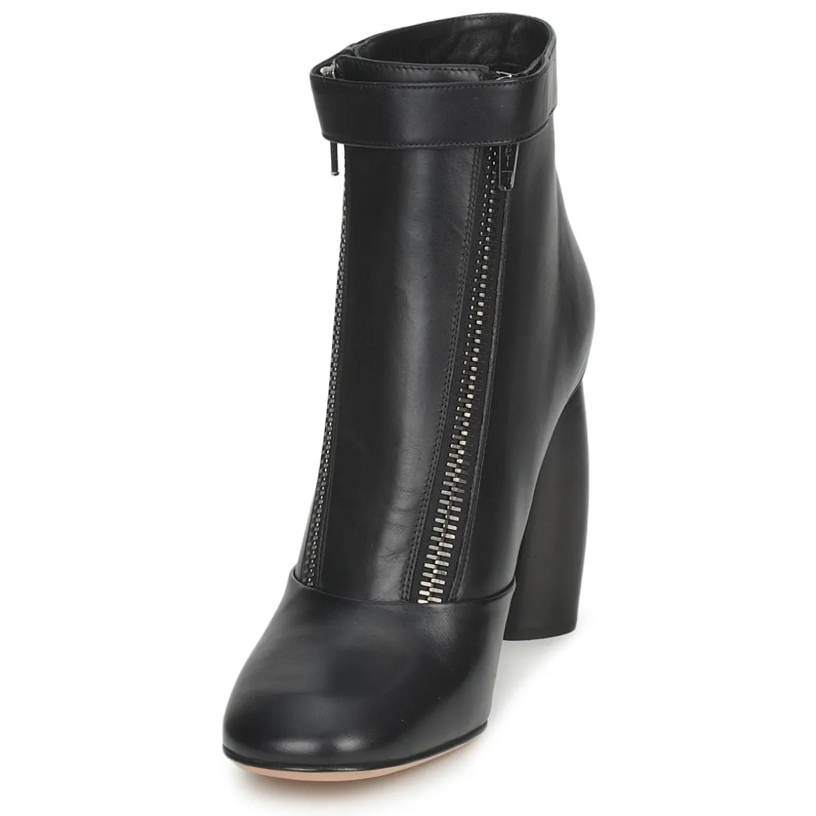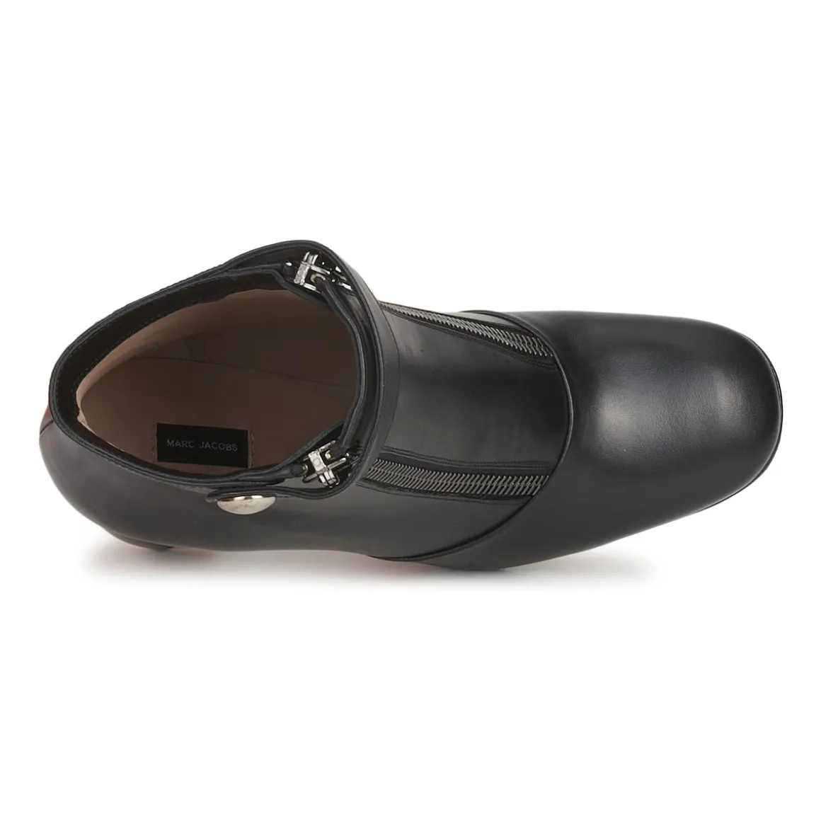 Bottines pour femme Marc Jacobs. Tige mid en cuir noir. Talon haut graphique. Deux fermetures par glissière sur la face antérieure. Bride boutonnée décorative.