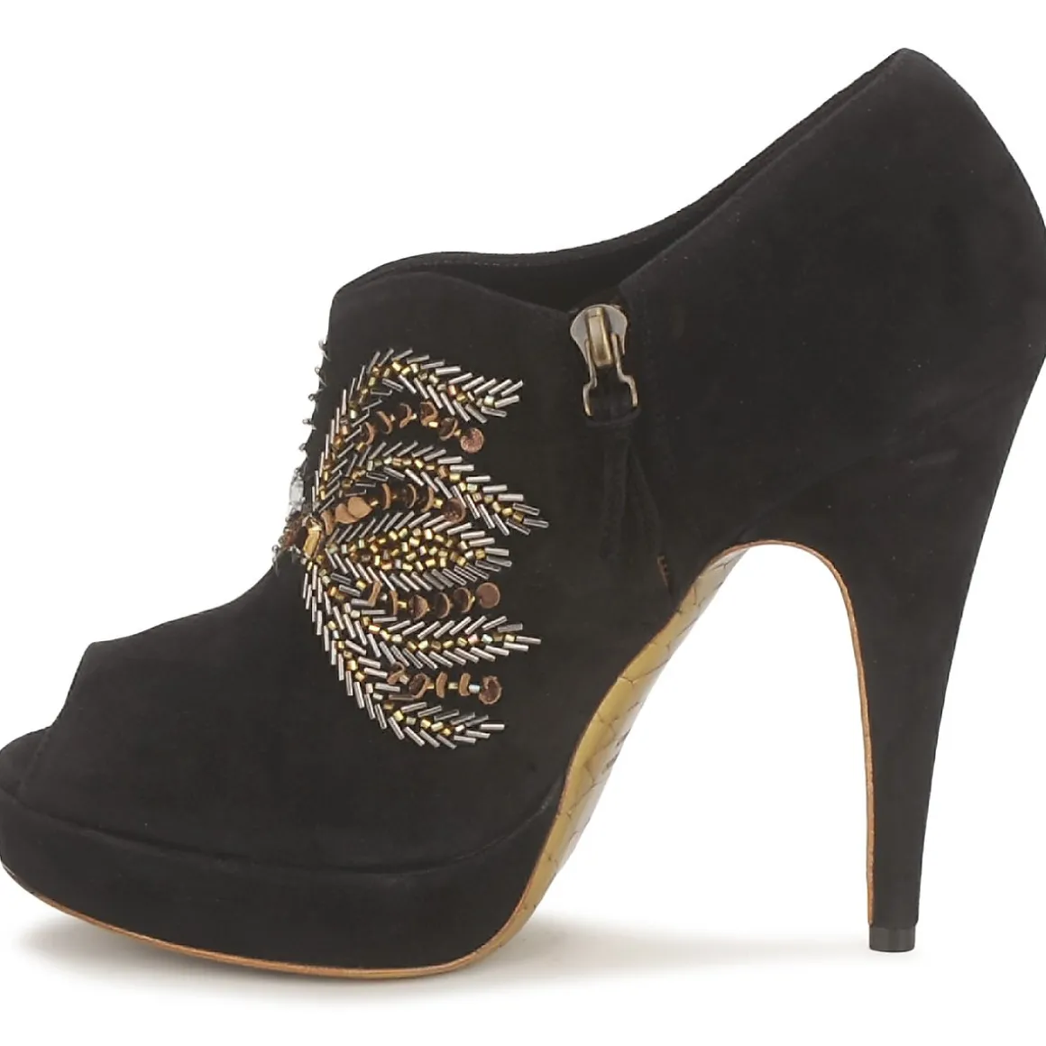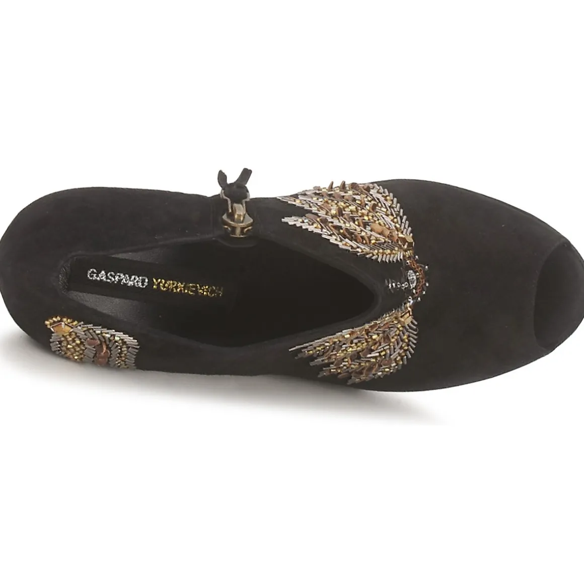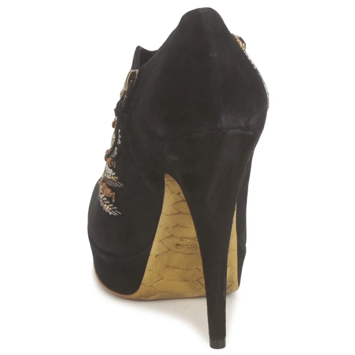 Low Boot Gaspard Yurkievich en cuir de veau sortie de la ligne glamour. Décor en perles et cristaux. Avant-pied ajouré. Semelle gold imprimée python, symbole de la collection Glamour de la maison avec film protecteur à ôter.