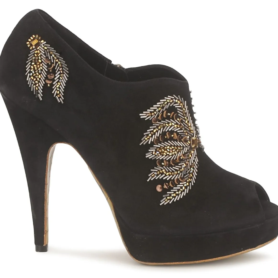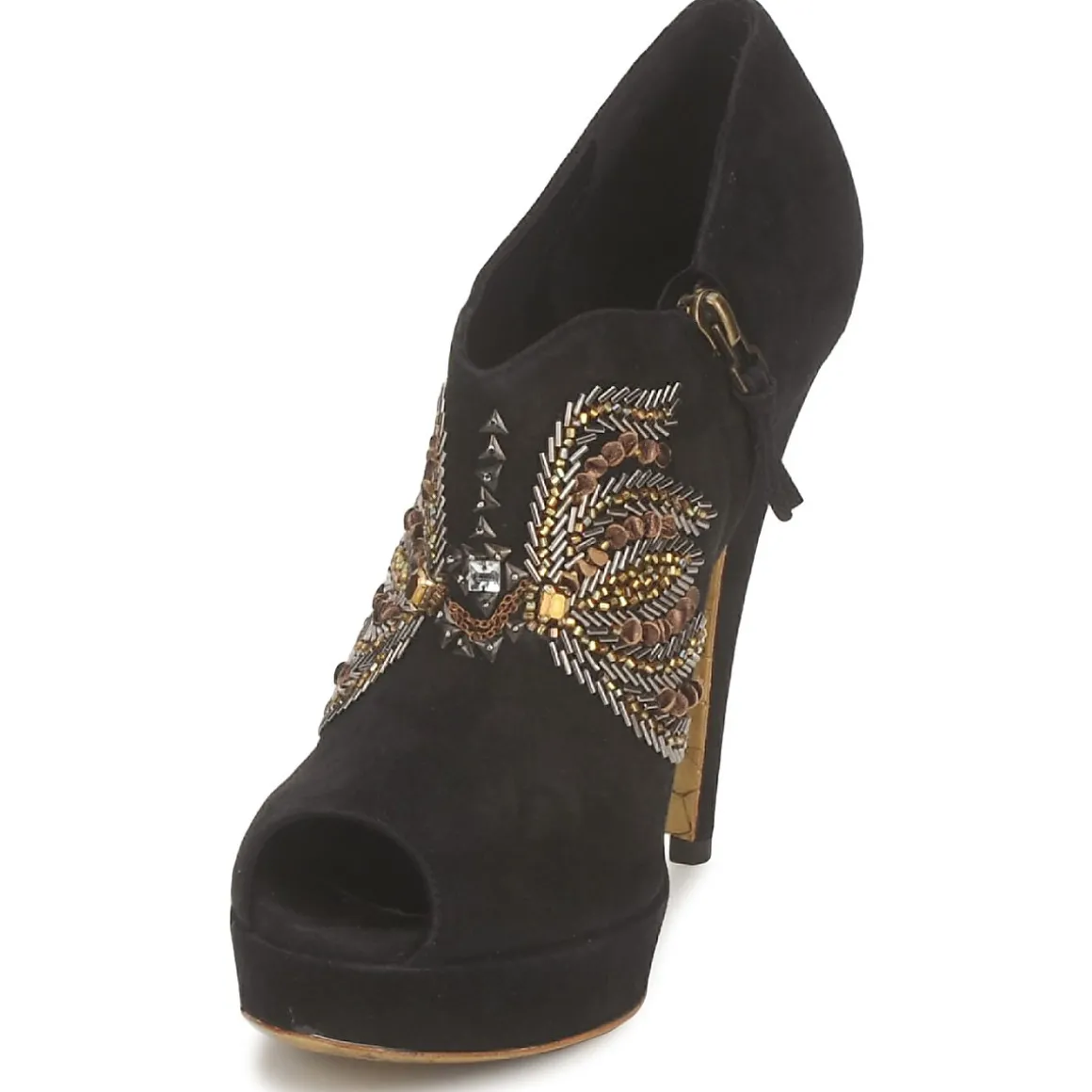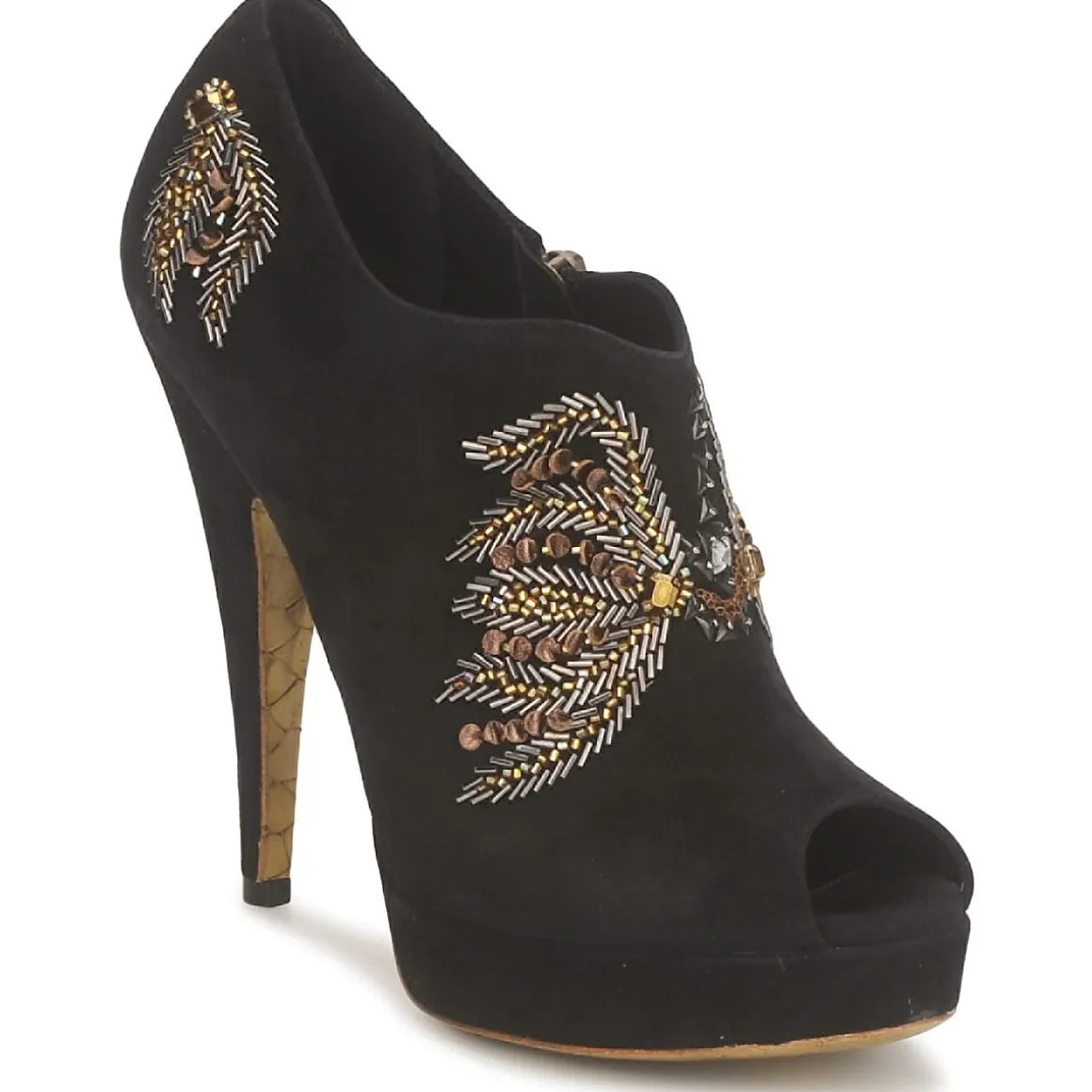 Low Boot Gaspard Yurkievich en cuir de veau sortie de la ligne glamour. Décor en perles et cristaux. Avant-pied ajouré. Semelle gold imprimée python, symbole de la collection Glamour de la maison avec film protecteur à ôter.