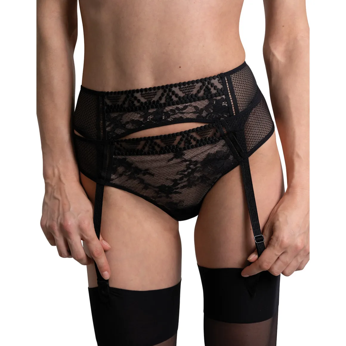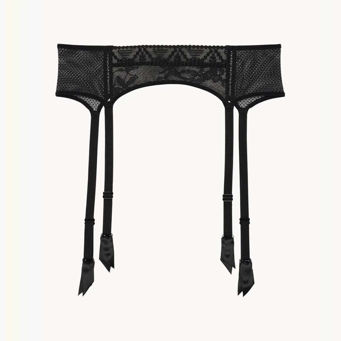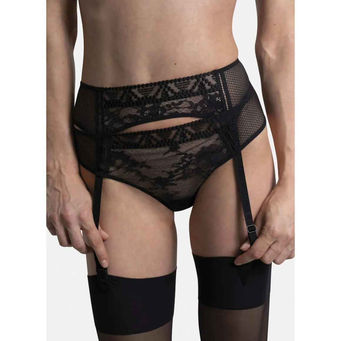 Le porte-jarretelle se veut une pièce maitresse dans l’art de la séduction.Il dispose d’une face avant qui associe subtilement la dentelle, la résille et une bande de broderie à la taille.Son dos est tout en légèreté priviligiant la délicatesse d’une résille unie.