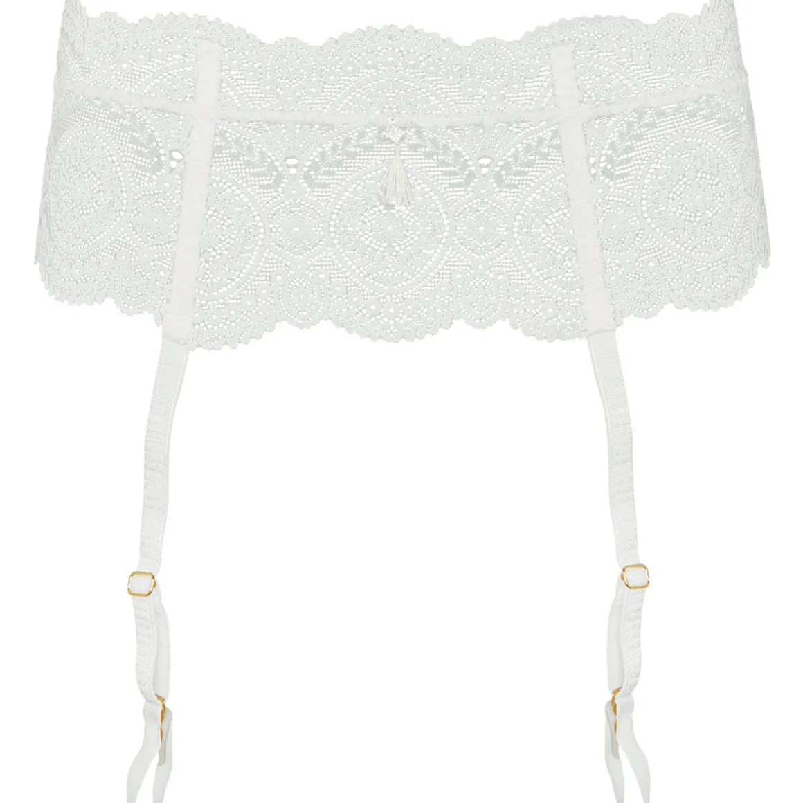 Porte-jarretelles dans une coupe séduisante en dentelle délicate et confortable grâce à un large élastique à la taille. 4 jarretelles réglables pour maintenir vos bas tout en douceur. Fermeture réglable par agrafes dans le dos. Petit bijou en pendentif à l’avant.