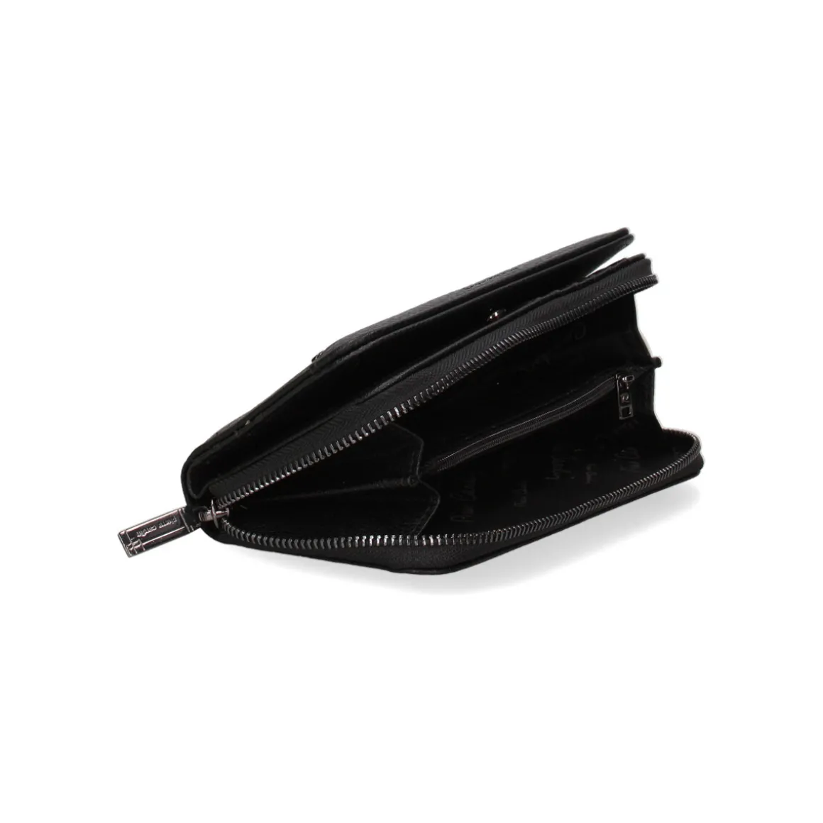 Portefeuille femme. La fermeture est avec zip. Les poches intérieures sont des porte-cartes pour les billets et les pièces. Les poches extérieures sont absentes. La bandoulière est manquante. Il manque la poignée. Il y a un compartiment interne. Le matériau externe est 100 % PU. À l’intérieur, il est 100 % polyester. Dimensions : 19x10x3 cm. Produit de mode
