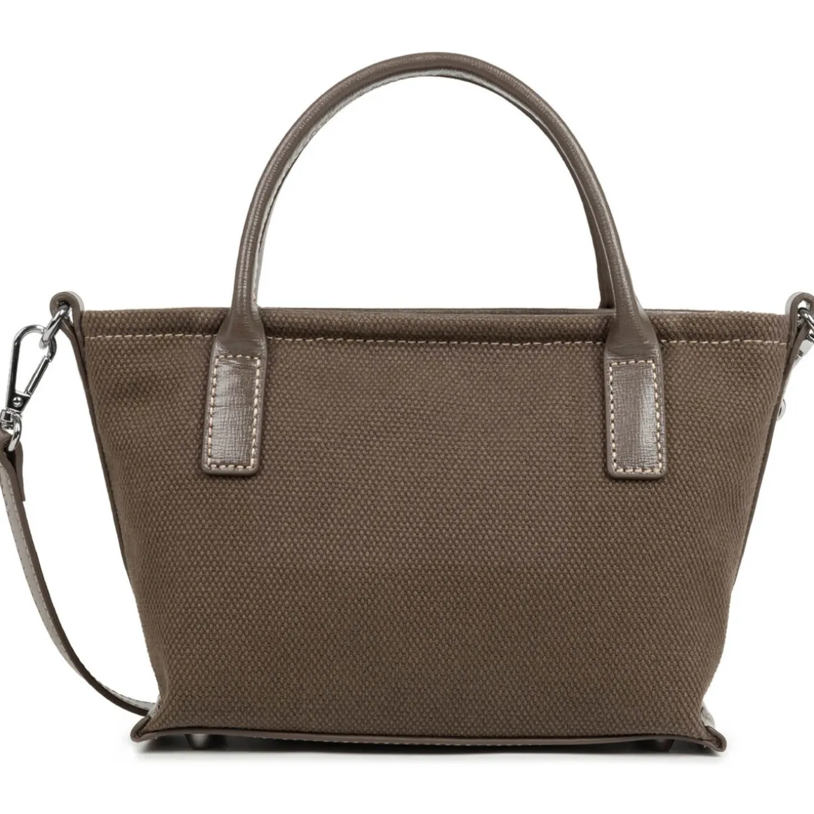 Ce mini sac cabas main est confectionné de coton garni de cuir de vachette. Il possède emplacement cartes frontales à pression, une poche intérieure zippée ainsi qu’une poche intérieure simple. Ses deux anses sont en cuir. Il se porte à la main, à l’épaule ou croisé. Dimensions : 20 x 15,5 x 8,5 cm