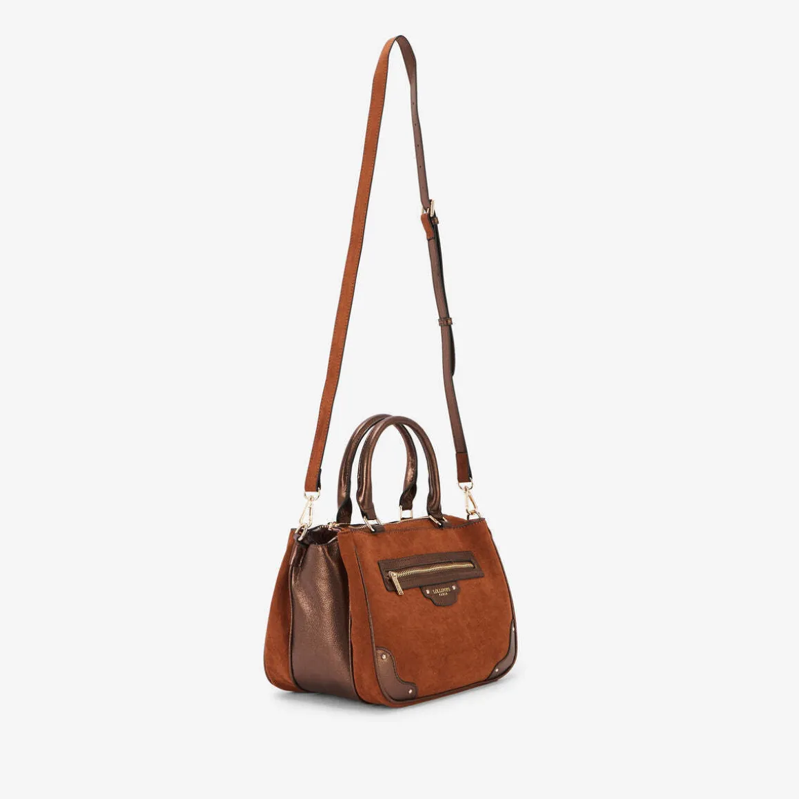 Sac shopper cognac bimatière effet suèdeDeux anses porté mainBandoulière réglable et amovibleFermeture principale zippéeDeux compartiments bouton pressionUne poche zippée à l’avant Une poche zippée et deux poches plaquées à l’intérieurHauteur : 20 cmLargeur : 9 cmLongueur : 28 cmCollection : Roberto