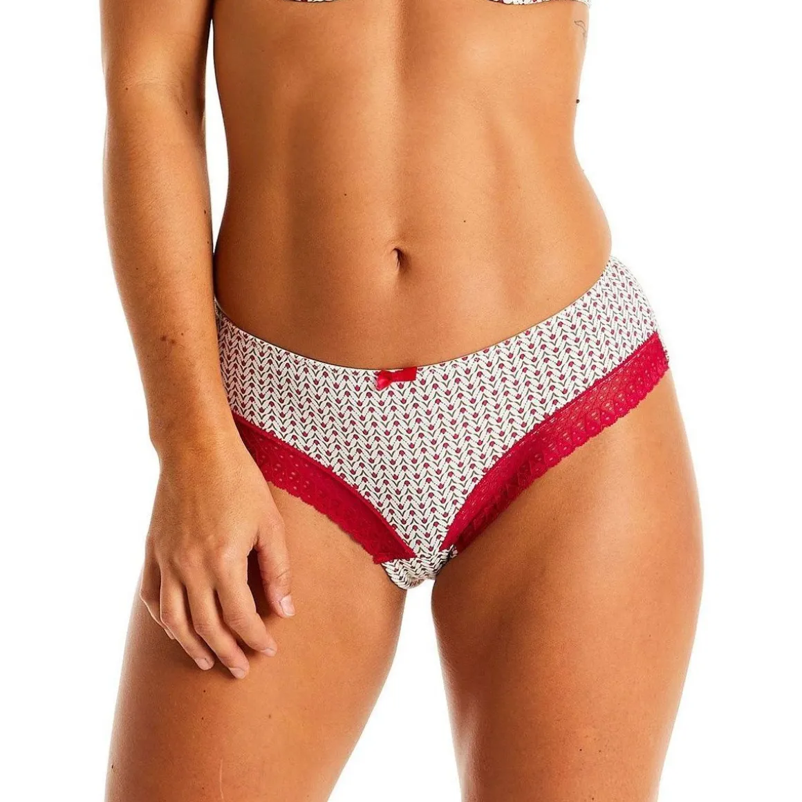 Shorty en microfibre imprimée au motif cravate. Galon de dentelle géométrique. Fond doublé d’un gousset 100% coton. Disponible du 36/38 au 46/48.