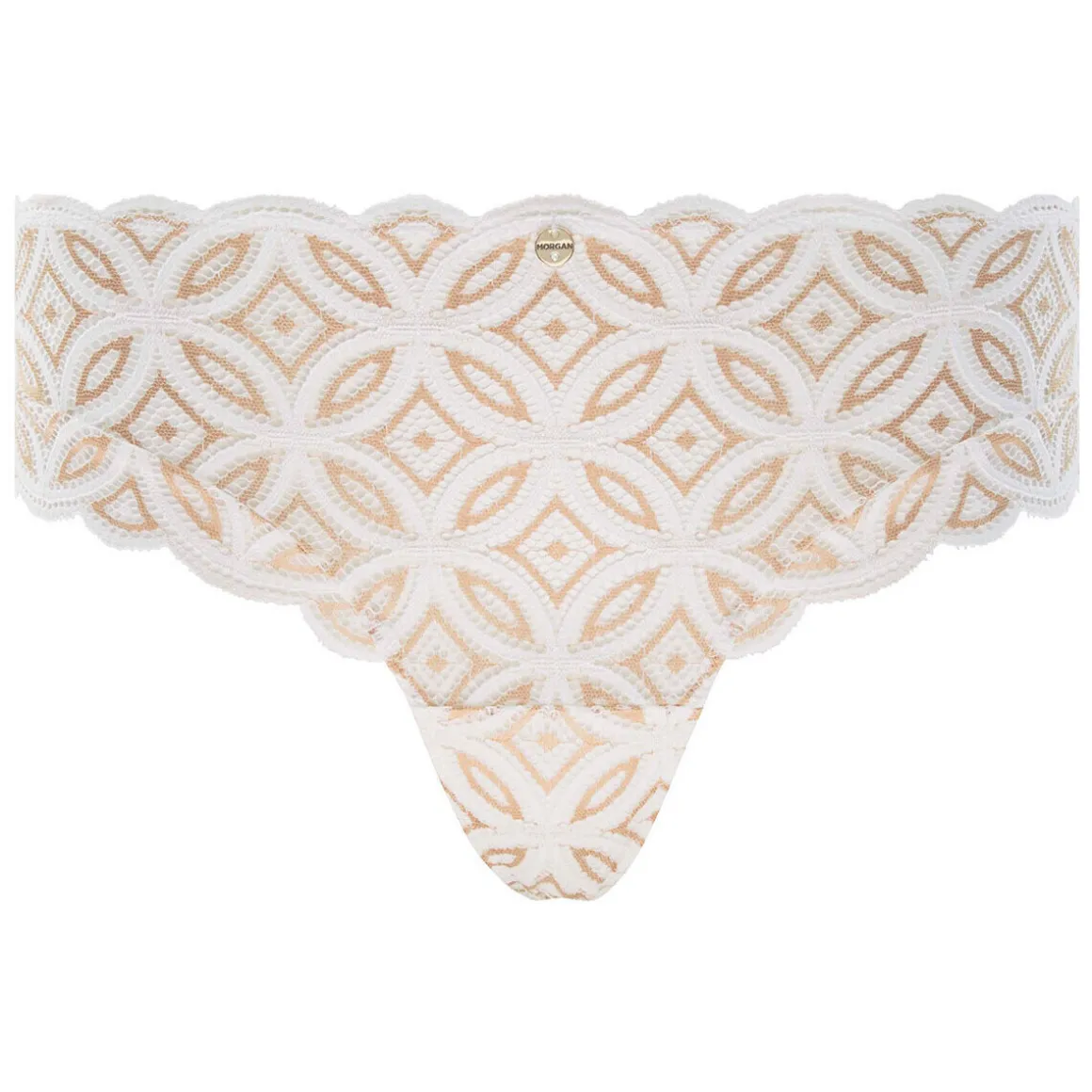 Shorty Tanga en dentelle graphique bicolore recyclée exclusive. Médaille logotée MORGAN à la ceinture élastiquée. Fond doublé d’un gousset 100% coton. Disponible du 36 au 46.