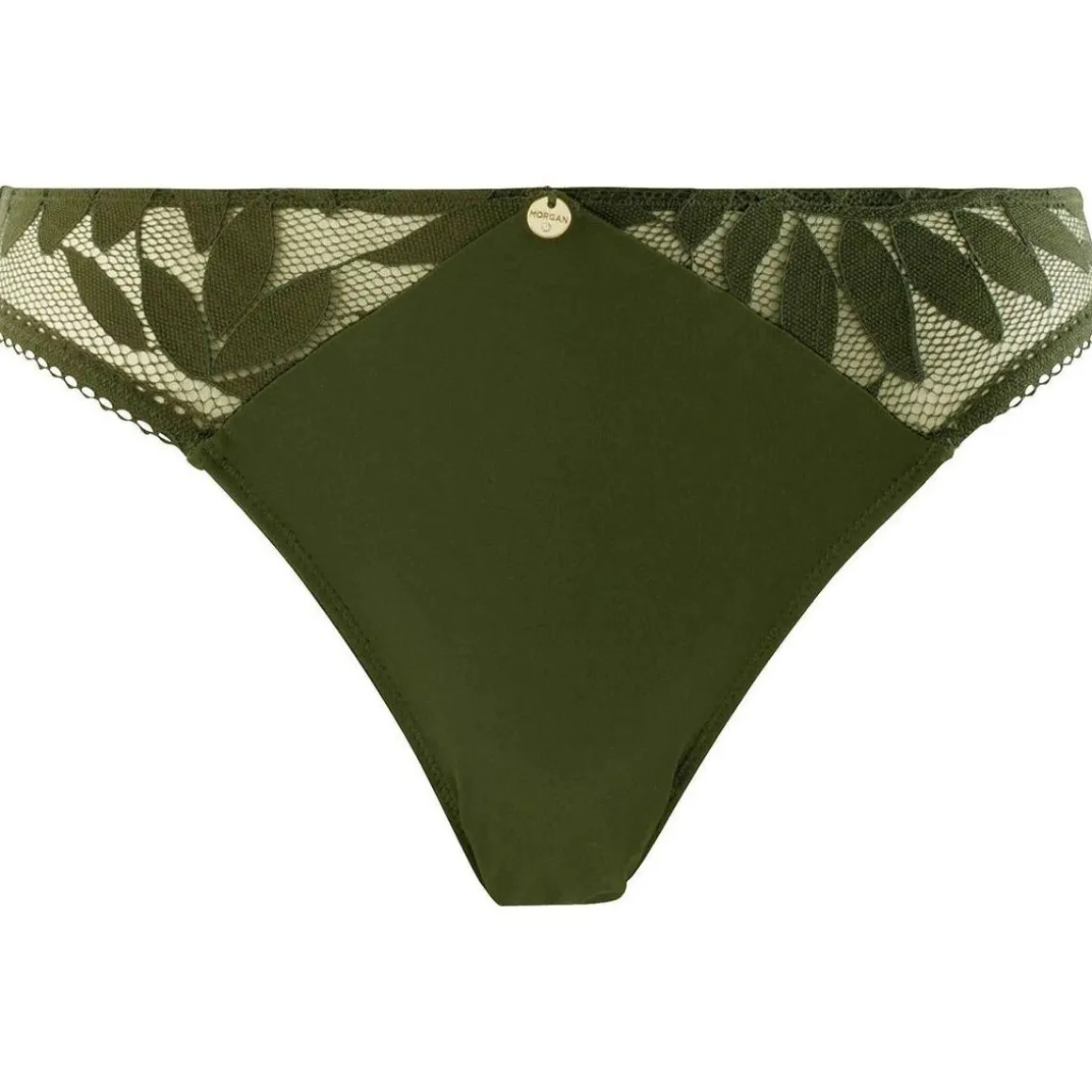 Slip tout en dentelle graphique feuillage. Médaille logotée MORGAN à la ceinture élastiquée. Fond doublé d’un gousset 100% coton. Disponible du 38 au 46.