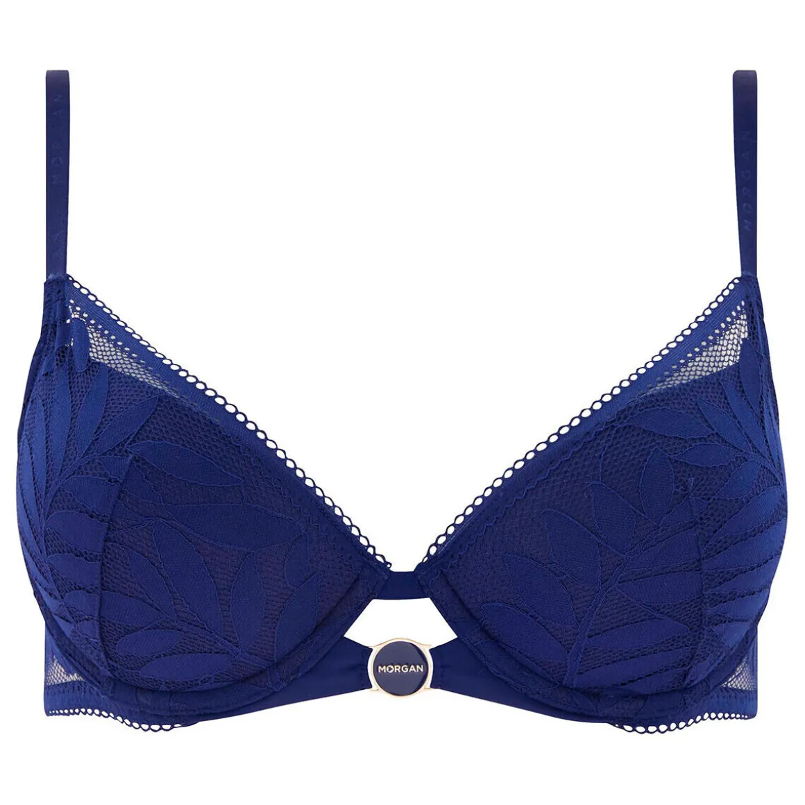 Soutien-gorge coques moulées. Décolleté classique. Tout en dentelle graphique feuillage. Bretelles fines embossées MORGAN. Médaille logotée MORGAN à l’entre-bonnets. Fermeture dos : 2 agrafes, 3 positions. Disponible du 85A au 100C.