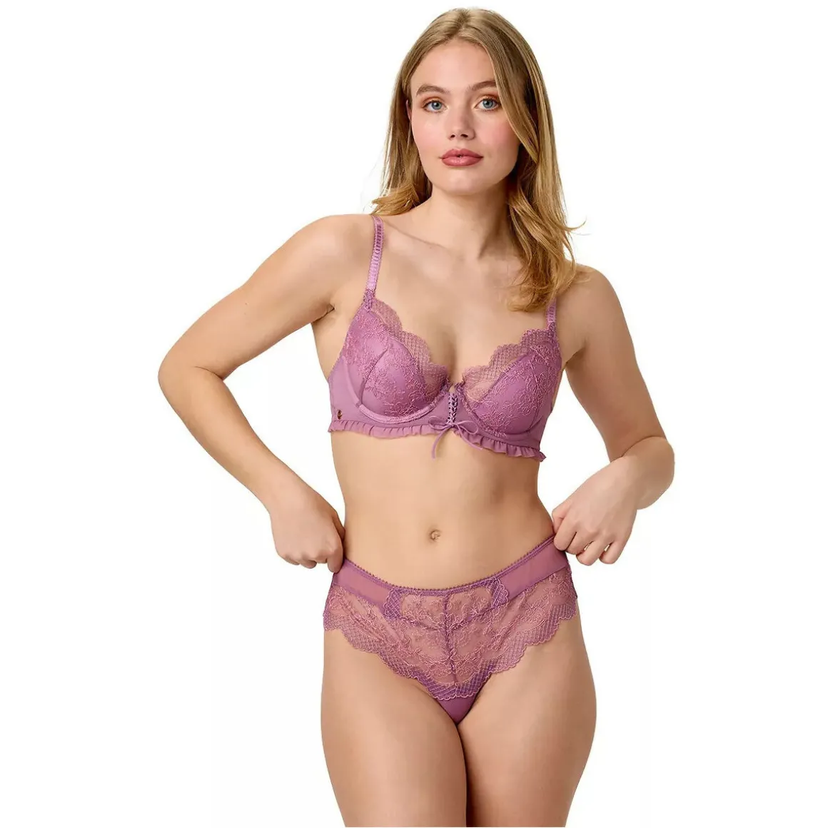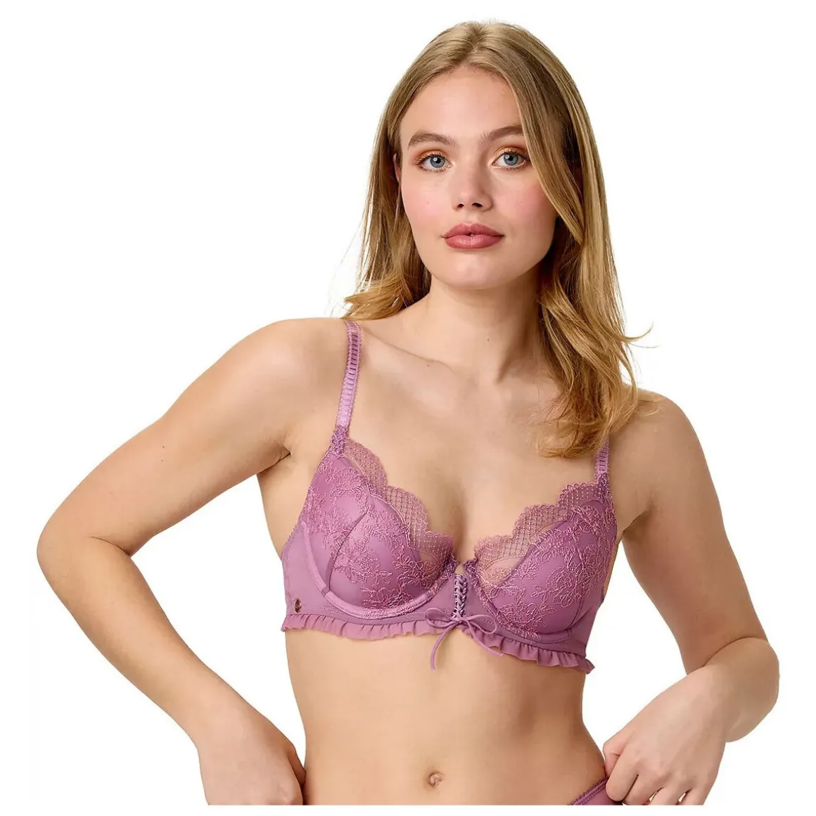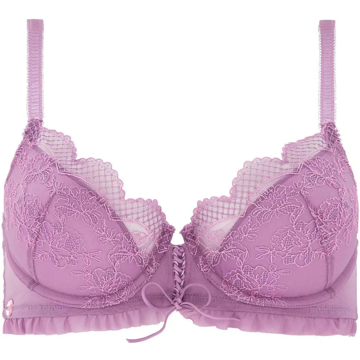 Soutien-gorge coques moulées. Décolleté classique. Coque forme sexy avec effet sublimant la poitrine. Tulle brodé. Laçage fantaisie à l’entre-bonnets. Fines bretelles réglables finition picots. Médaille BB sur l’aile. Tulle plissé sous poitrine. Fermeture dos : 2 agrafes, 3 positions. Disponible du 85B au 95C.