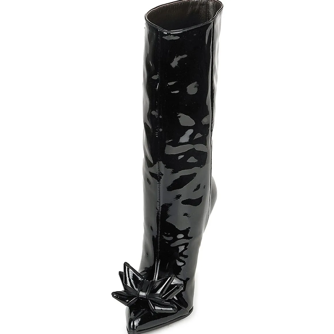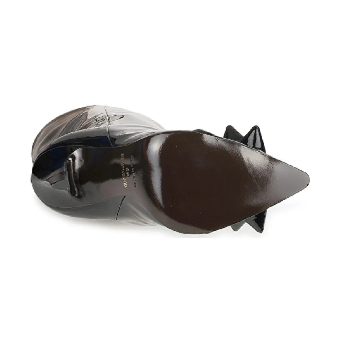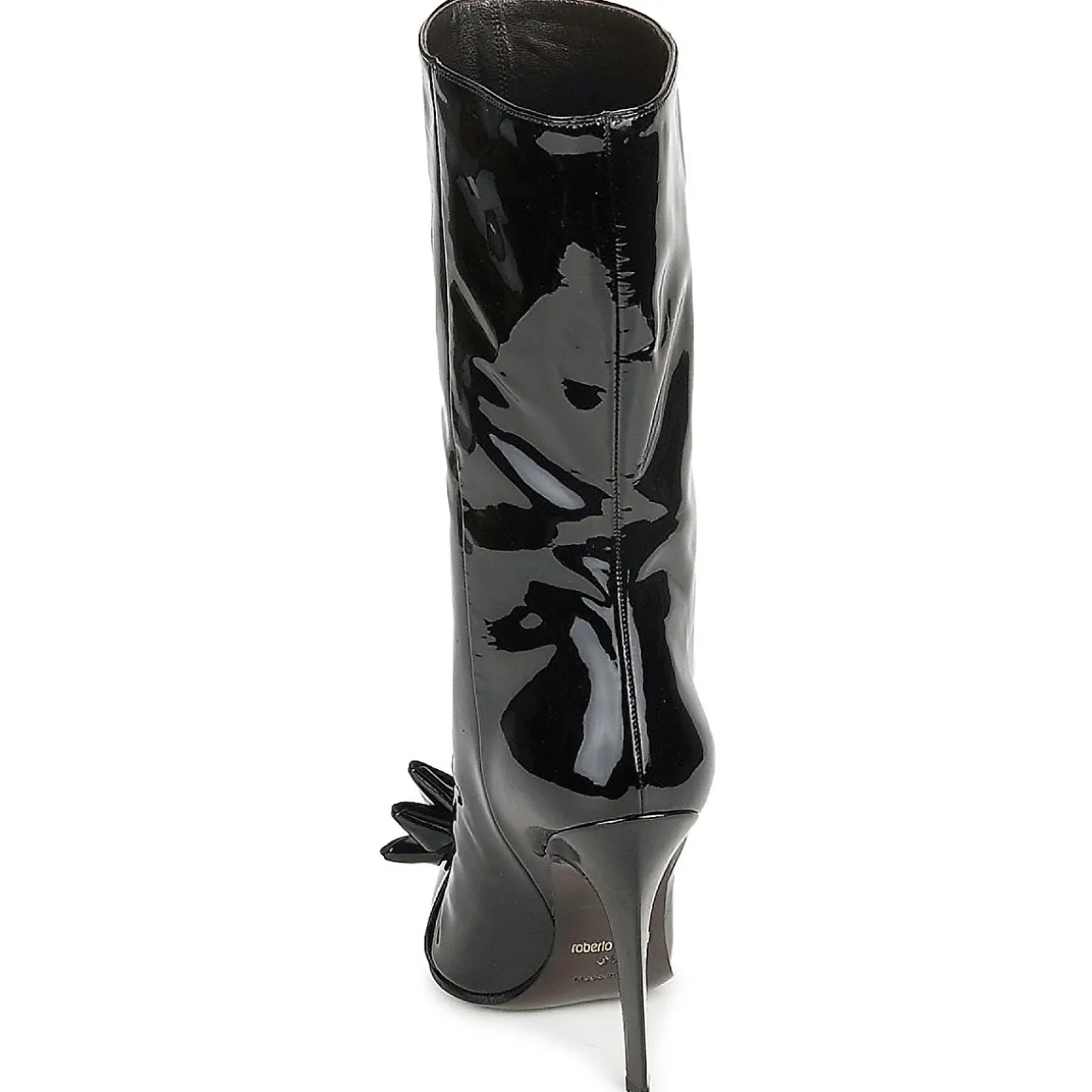 Bottine Roberto Cavalli en cuir verni. Bout pointu accessoirisé d’un noeud à la structure fantaisie. Talon haut provoquant une cambrure harmonieuse et résolument féministe.