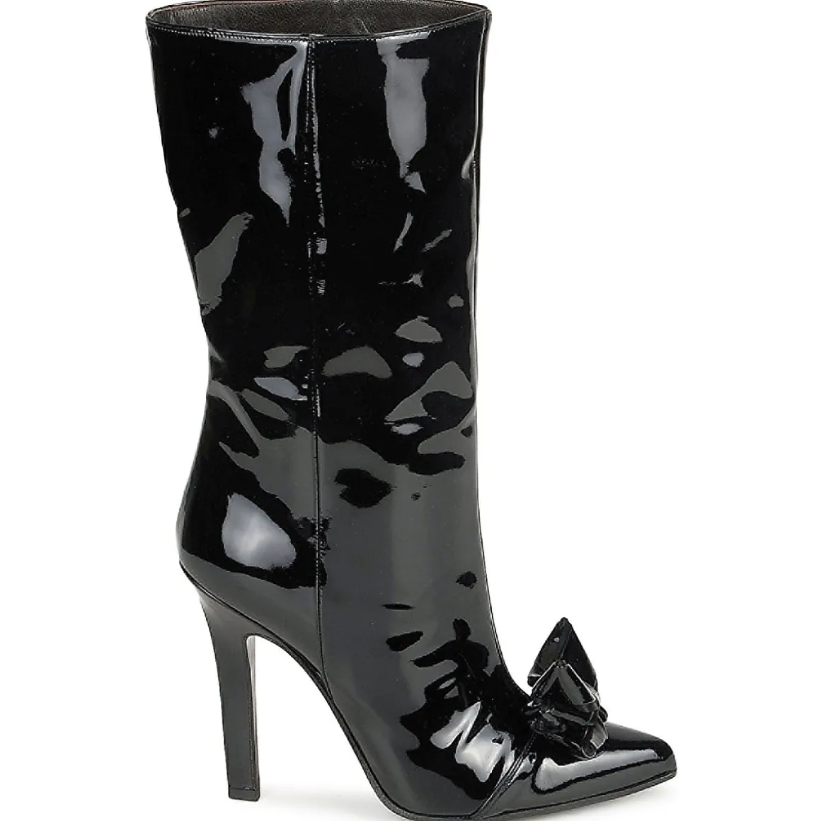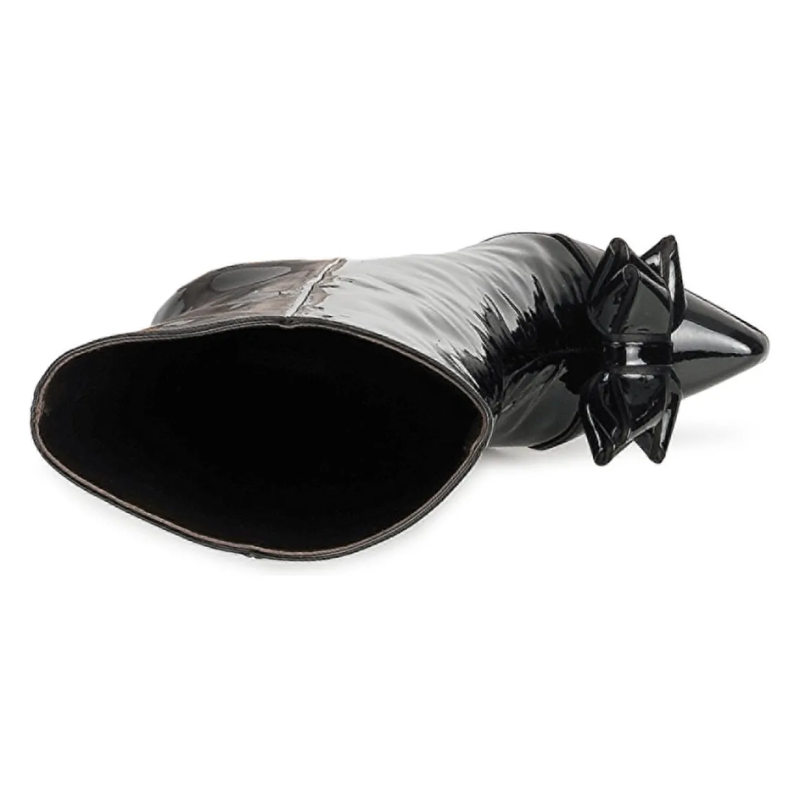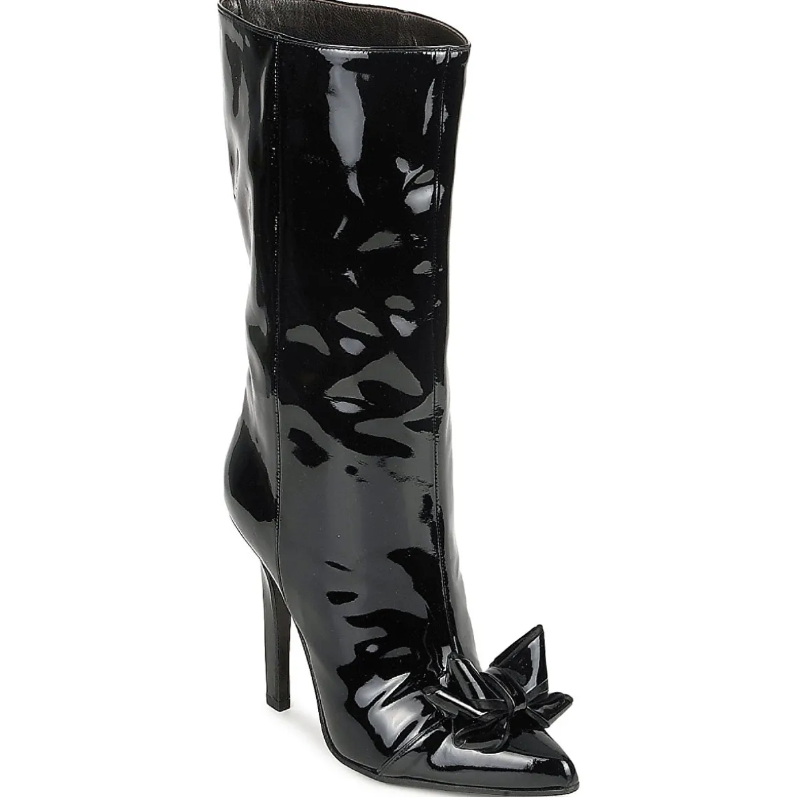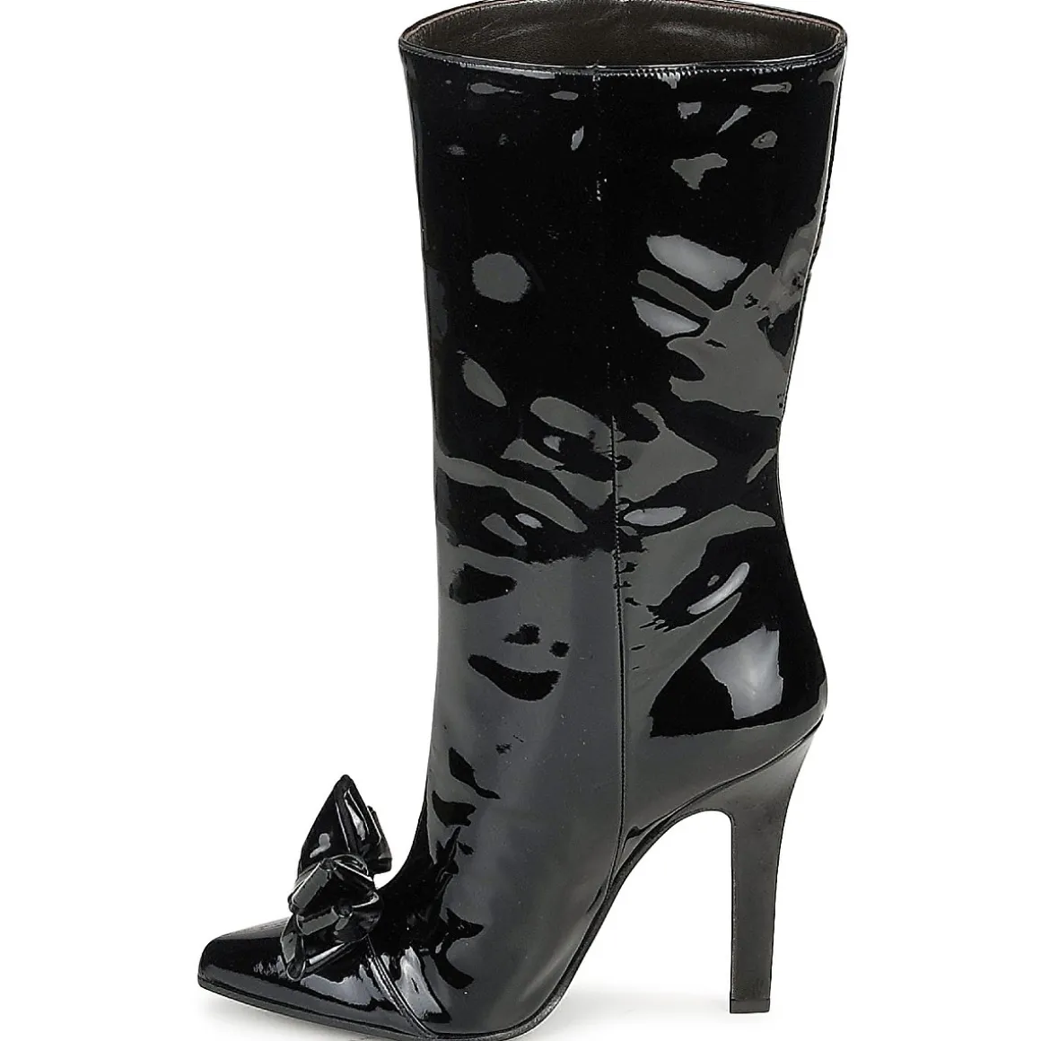 Bottine Roberto Cavalli en cuir verni. Bout pointu accessoirisé d’un noeud à la structure fantaisie. Talon haut provoquant une cambrure harmonieuse et résolument féministe.