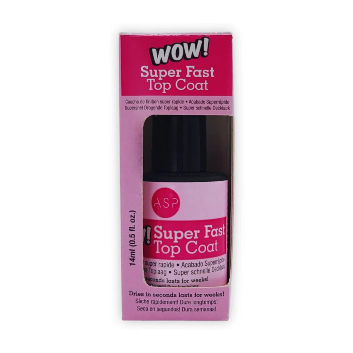 Le Top Coat Super Fast Wow! ASP (14 ml) sèche rapidement en quelques secondes et prolonge la durée de vie de votre vernis. Il renforce la couleur et offre un fini ultra-brillant et résistant pour des ongles parfaits plus longtemps. Indispensable pour une manucure impeccable ! Le Top Coat Super Fast Wow! de la marque ASP, avec sa contenance pratique de 14 ml, est un indispensable pour toute manucure réussie. Grâce à sa formule innovante, il sèche la laque en quelques secondes seulement, vous faisant gagner un temps précieux tout en assurant une finition parfaite. Ce top coat est idéal pour celles et ceux qui souhaitent des ongles impeccables rapidement.En plus de son séchage ultra-rapide, le Top Coat Super Fast Wow! prolonge efficacement la durée de vie du vernis. Sa formule renforce la couleur et protège votre manucure des éclats et des fissures, pour un rendu impeccable qui dure plusieurs jours. Sa capacité à préserver l’intensité de la teinte vous garantit des ongles éclatants et colorés plus longtemps.Enfin, le Top Coat Super Fast Wow! ASP (14 ml) offre un fini ultra-brillant et résistant, sublimant vos ongles avec élégance. Ce top coat protège également votre vernis des agressions extérieures, pour un effet longue durée qui ne ternit pas. Grâce à sa tenue renforcée, vos mains restent soignées, brillantes et parfaites au quotidien.