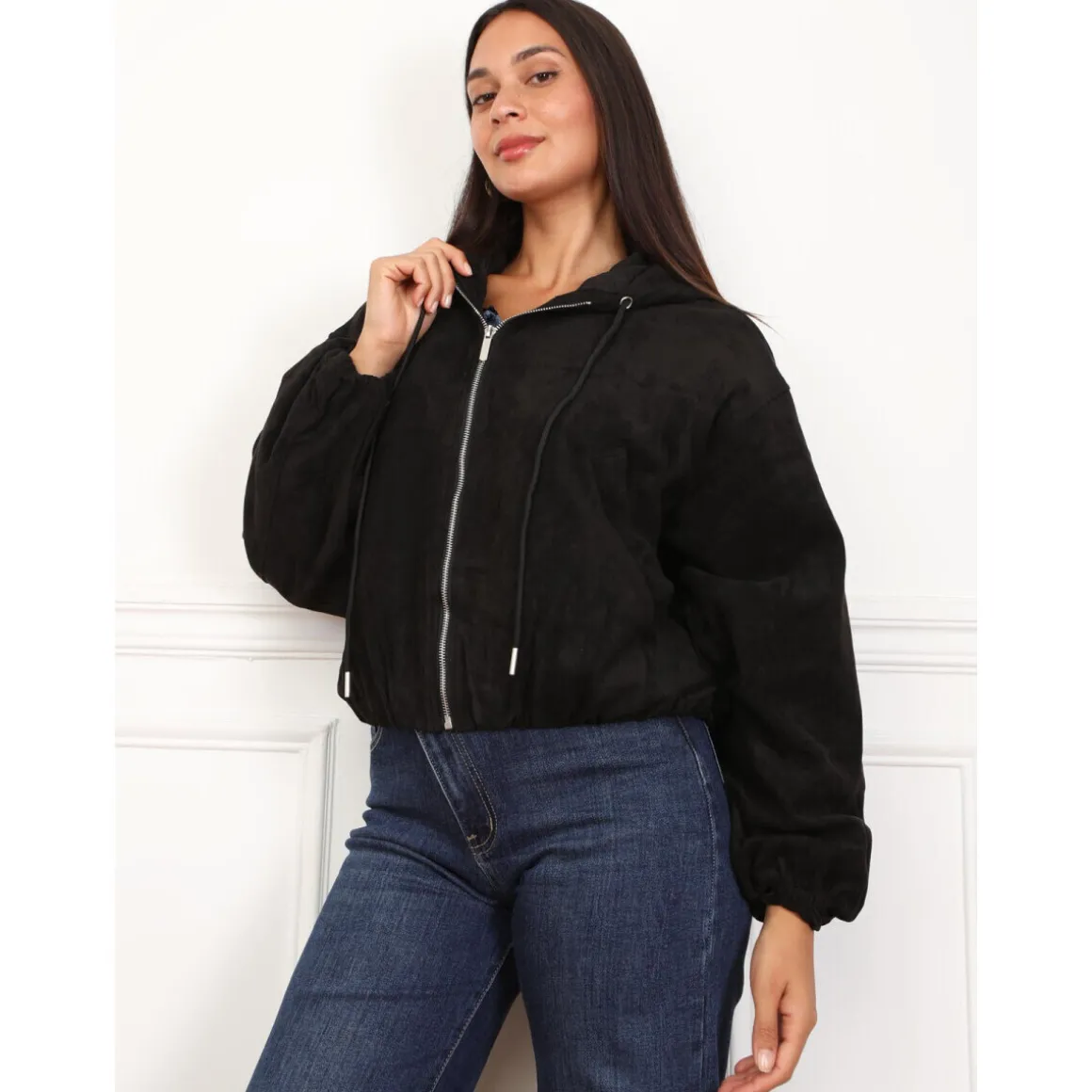 Veste bomber en suédine avec fermeture zippée.Dotée d’une capuche avec cordons et de deux poches latérales.Taille et bas des manches élastiqués.Doublure satinée.