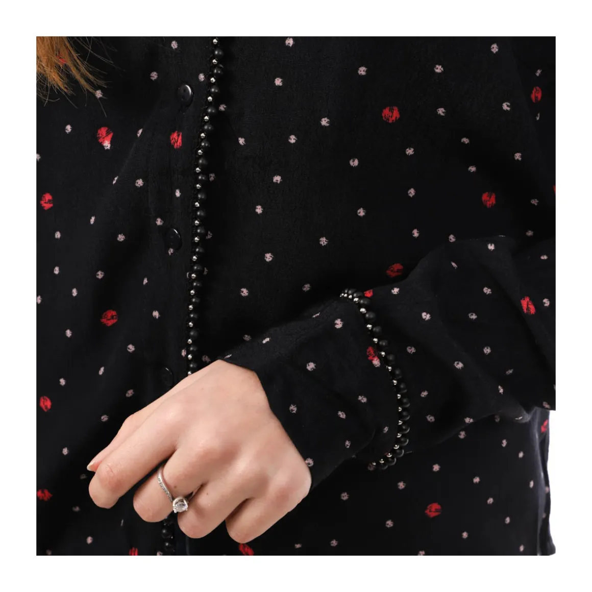 Chemise femme de la marque Teddy Smith Manches longues Fermeture à boutons Coloris : Marine Imprimé Perles sur les manches , le col et sur l’avant Composition : 100% viscose