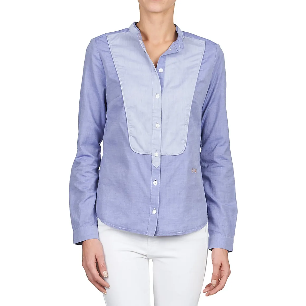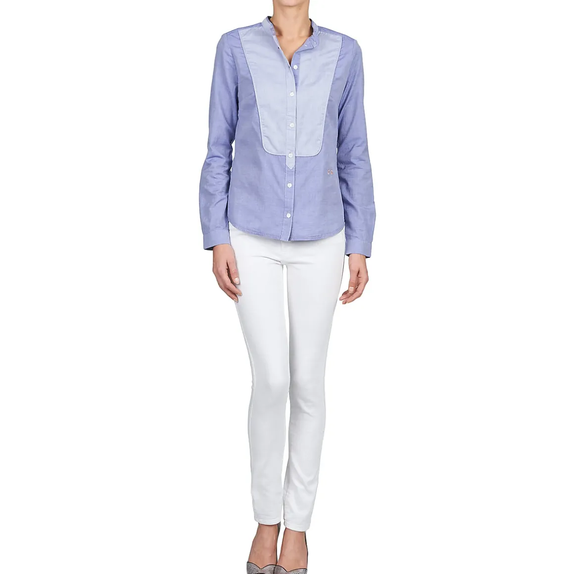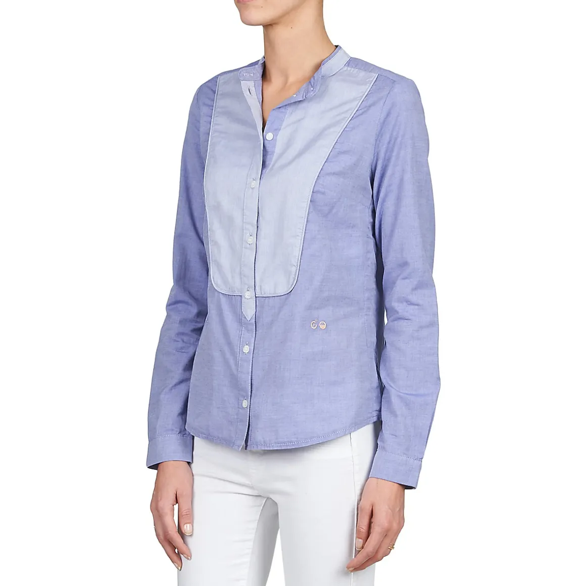 Envie d’un look un brin boyish ? Alors sans hésiter, on vous conseille cette chemise pensée par Kookai. Elle possède une coupe sage, avec un col haut, et affiche un empiècement contrastant au niveau de la poitrine, qui rappelle un peu les habits des garçons de café. Avec un chino et de jolis derbies, elle sera parfaite !