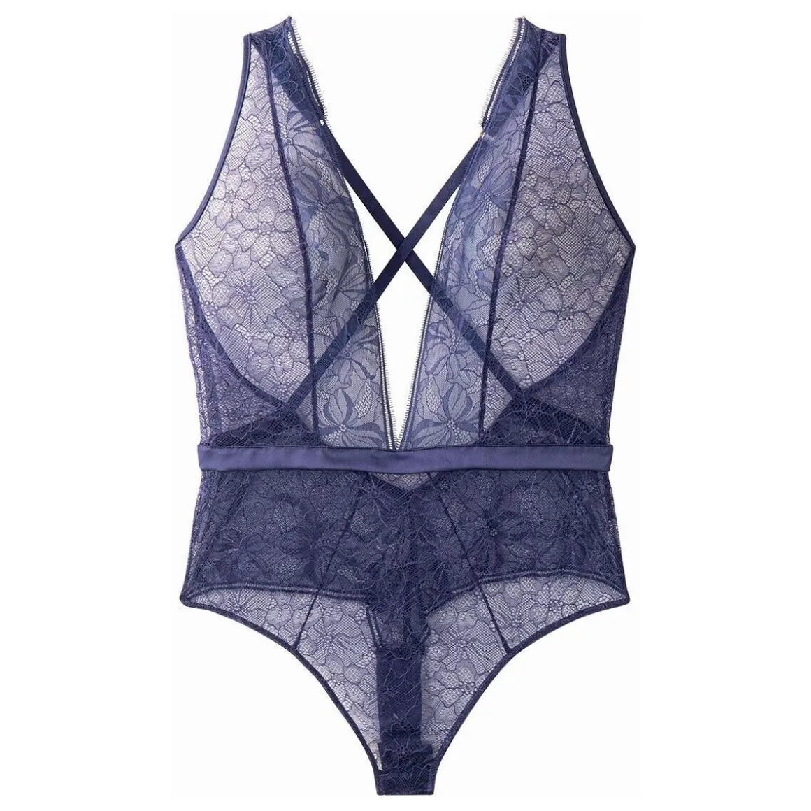 Body-tanga en dentelle . Empiècements de satin et dentelle effet de cil délicate . Décolleté plongeant. Jeu d’élastiques bondage au dos. Bretelles fines et réglables. Disponible du 36/38 au 46/48.