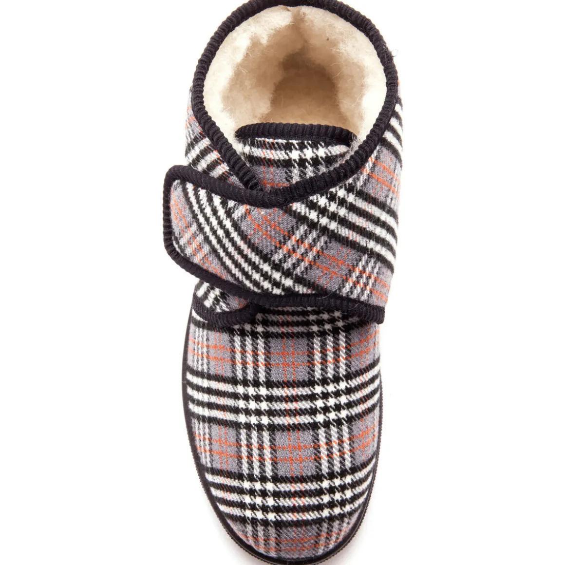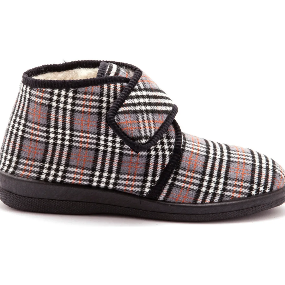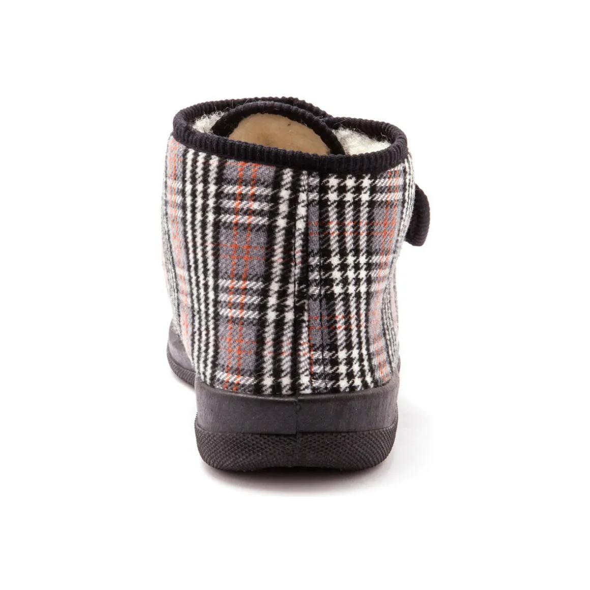 Ils sont fourrés et une bande auto-agrippante est prévue pour une large ouverture et une parfaite adaptation au cou-de-pied. Dessus moelleux en tissu épais sur mousse. Finition biais. Grande largeur.