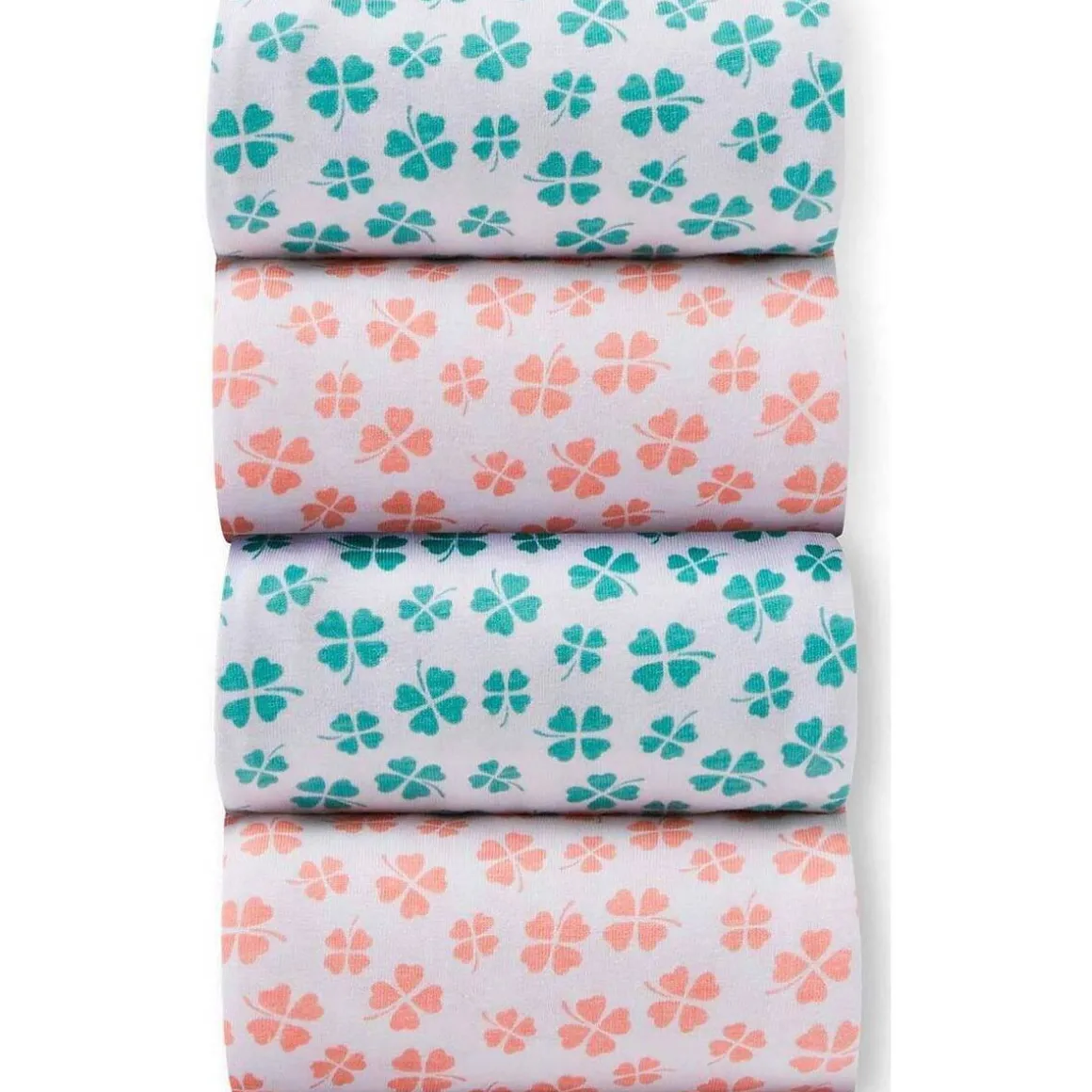 Lot de 4 culottes : 2 imprimées aqua + 2 imprimées saumon. Elastique sous tunnel à la taille. Picot élastiqué aux jambes. Fond doublé coton.