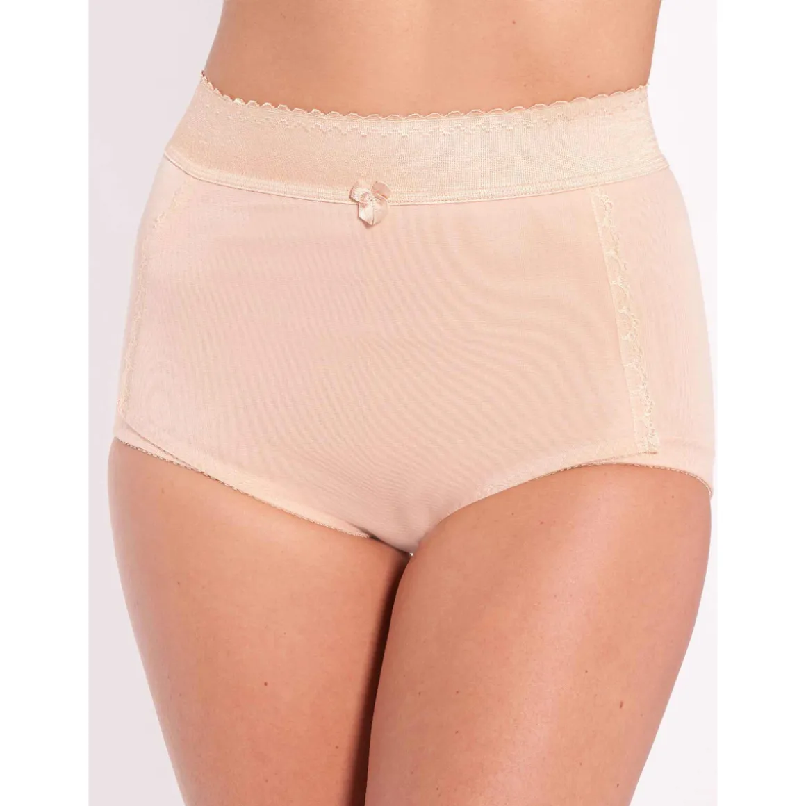 Affine la silhouette discrètement en effaçant le ventre. Plastron double épaisseur souligné d’une fine dentelle. Large élastique duveteux à la taille haute. Découpe galbée au dos. Entièrement doublée. Fond doublé coton.Photo retouchée