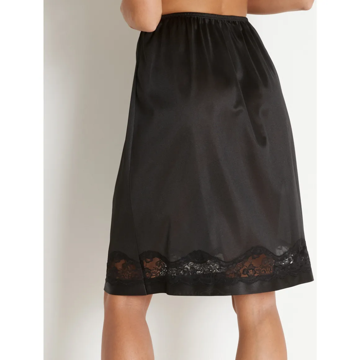 Entre-deux en dentelle incrustée. Taille élastiquée. Base ourlée n’accrochant pas les collants. Longueur 60cm environ. Maille traitée antisatique.