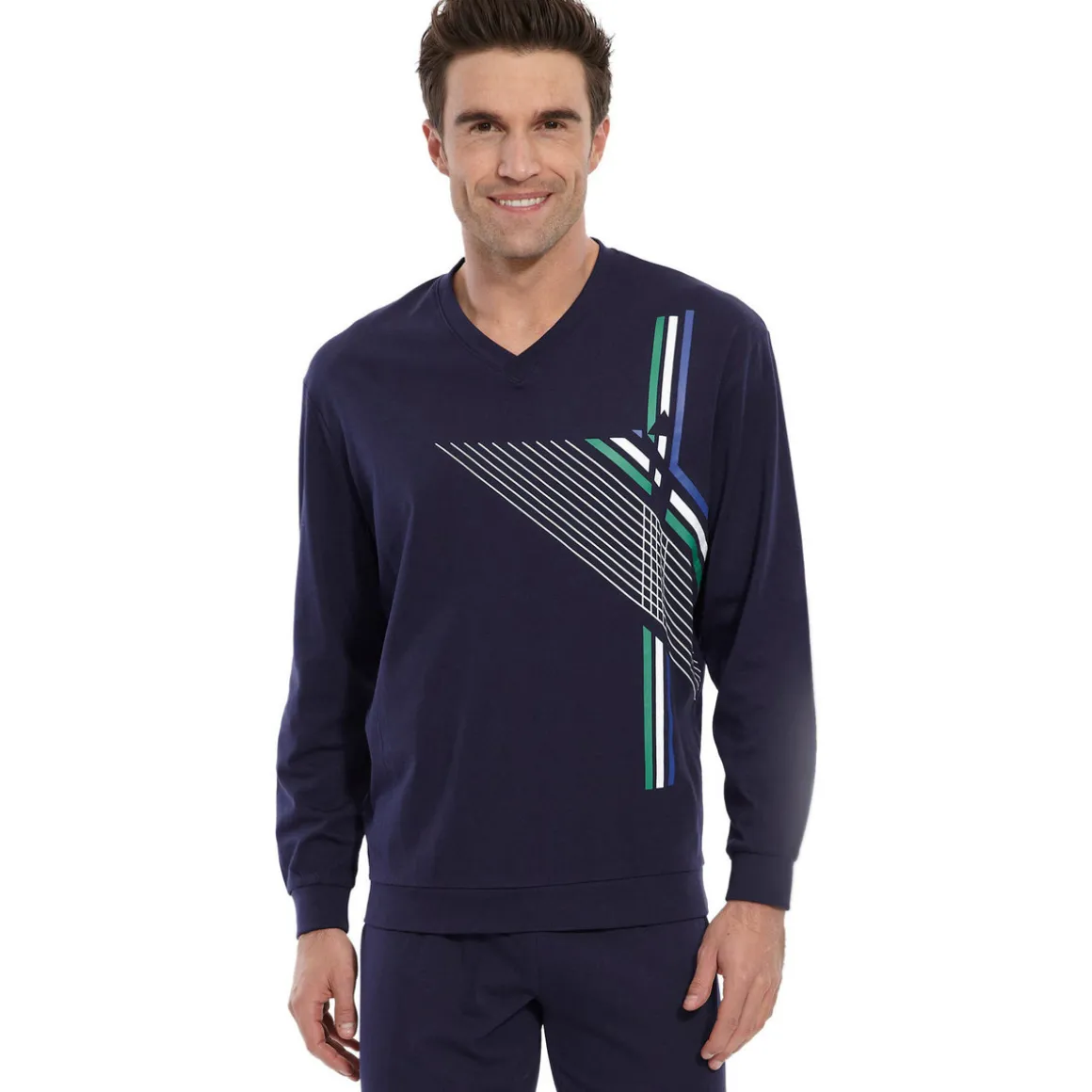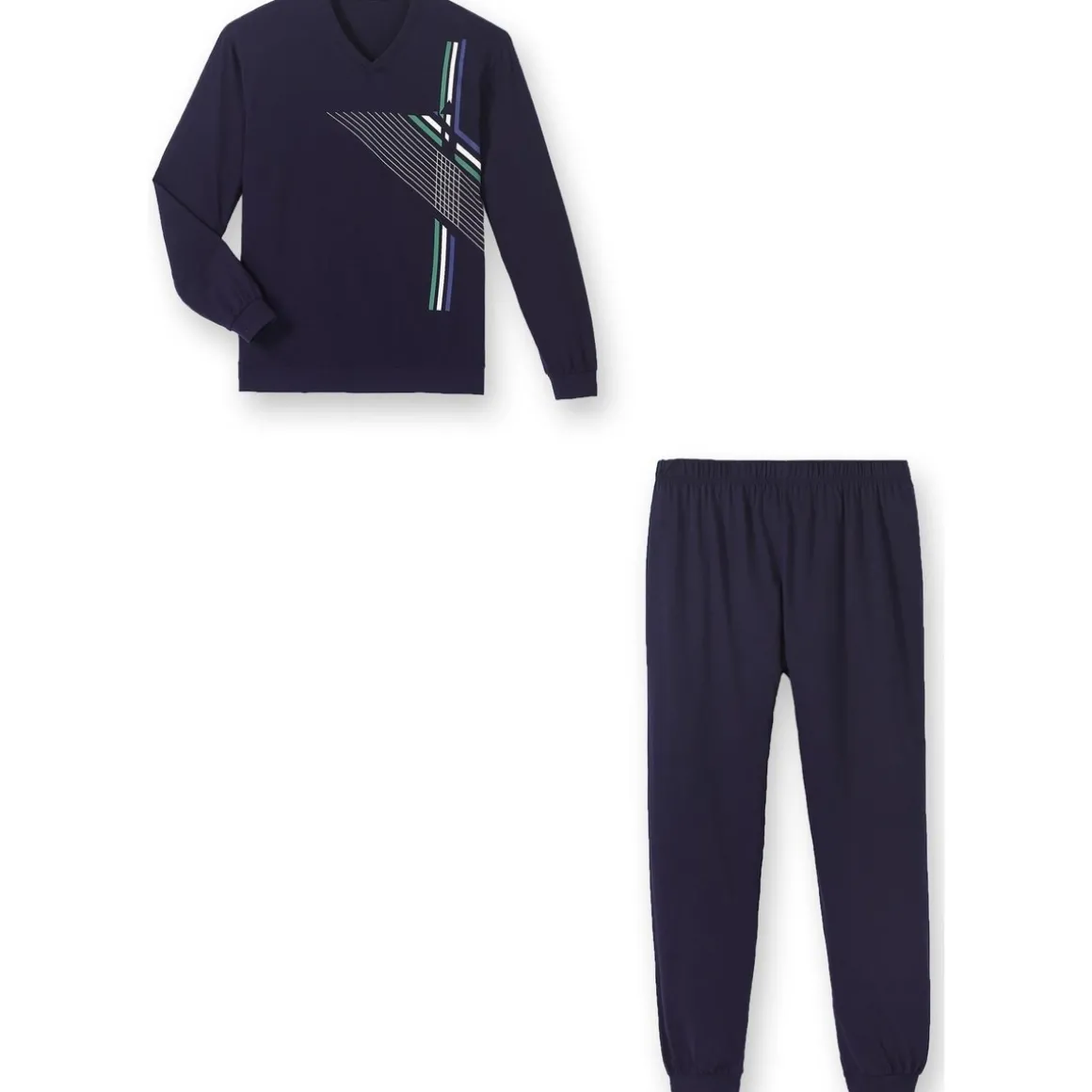 Le pyjama vous offre un confort et une chaleur appréciables. Le haut : motif géométrique placé devant. Double bord-côtes à l’encolure V, aux poignets et à la base. Longueur 72 cm environ. Le pantalon uni : taille élastiquée. Double bord-côtes chevilles. Entrejambe 75 cm. Lavable machine.Photo retouchée